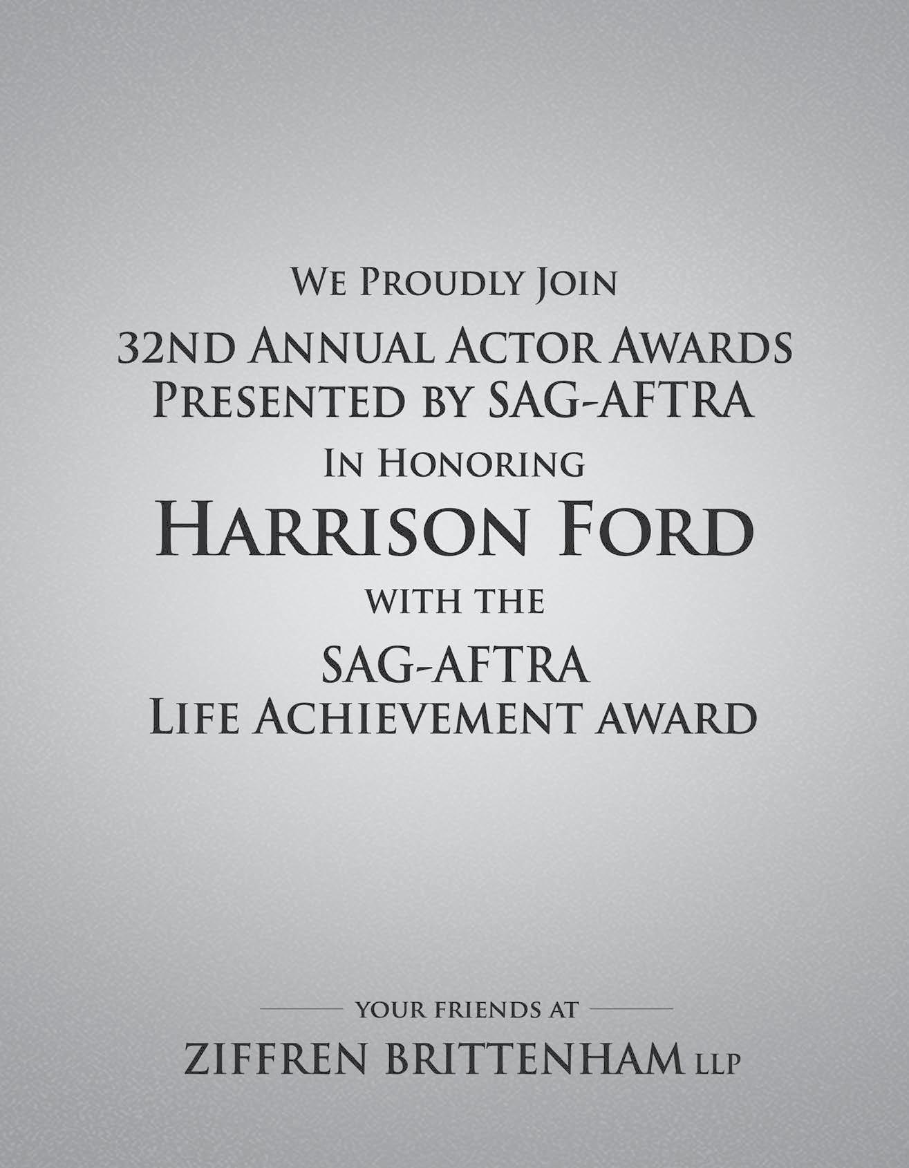 WE PROUDLY JOIN SAG-AFTRA in congratulating the nominees of THE 32nd ANNUAL ACTOR AWARDS and congratulate HARRISON FORD