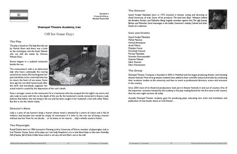 The Playwright Raoof Dashti, born in 1984, licensed in Painting at Arts University of Tehran, member of playwrights club in Iran Theater House. Some of his plays are I am Iradj, Fereydoon's son, or tree blood drops on the snow, Humidity, Full of leaves, full of birds, A little house which is not very old and Man's rest to the wall.