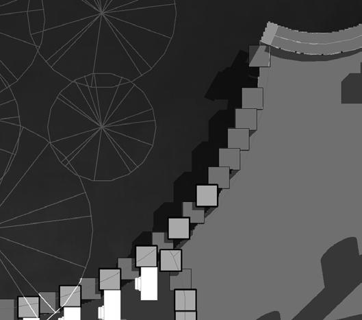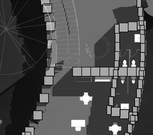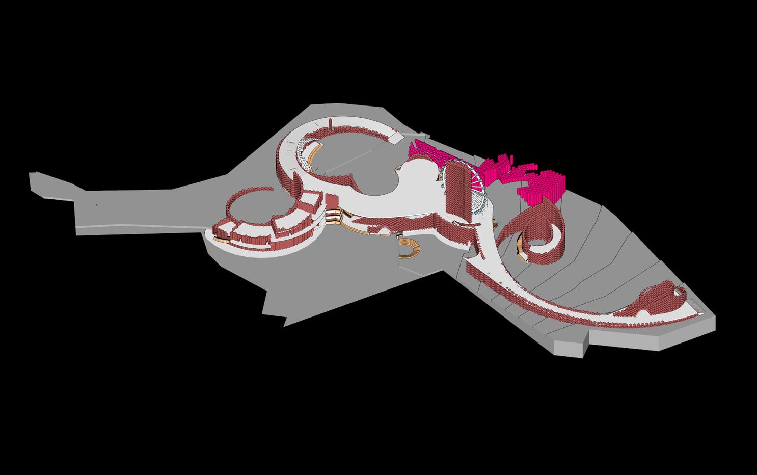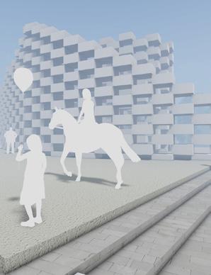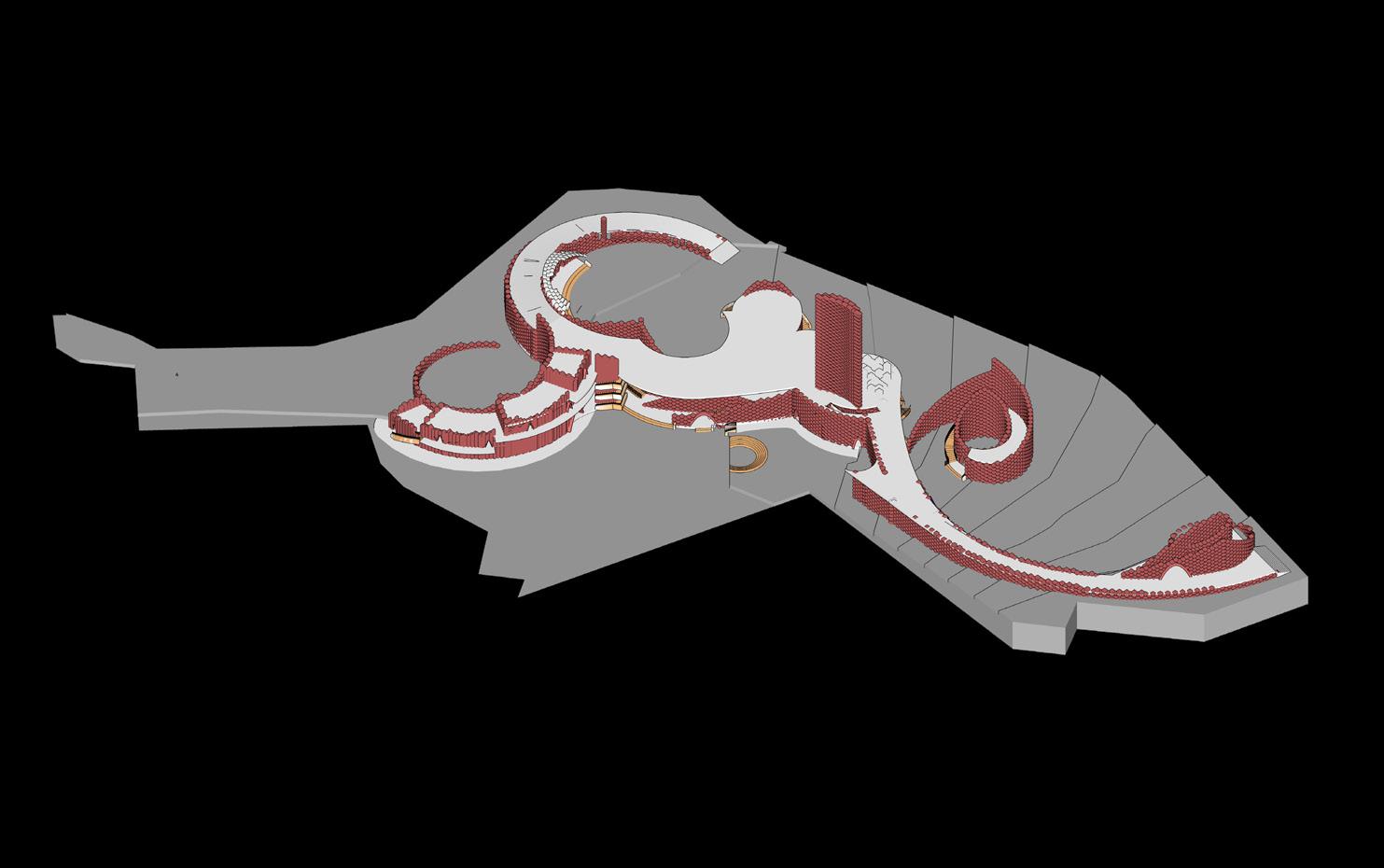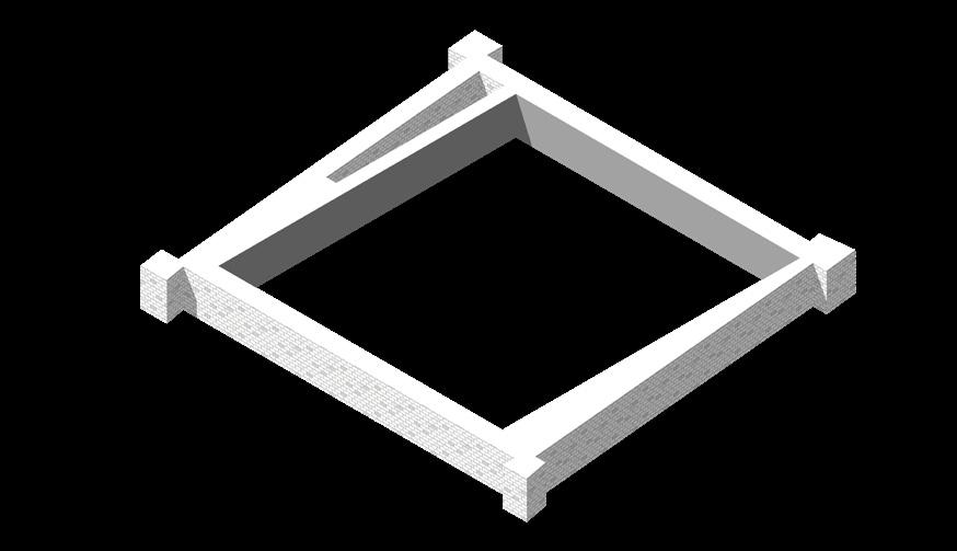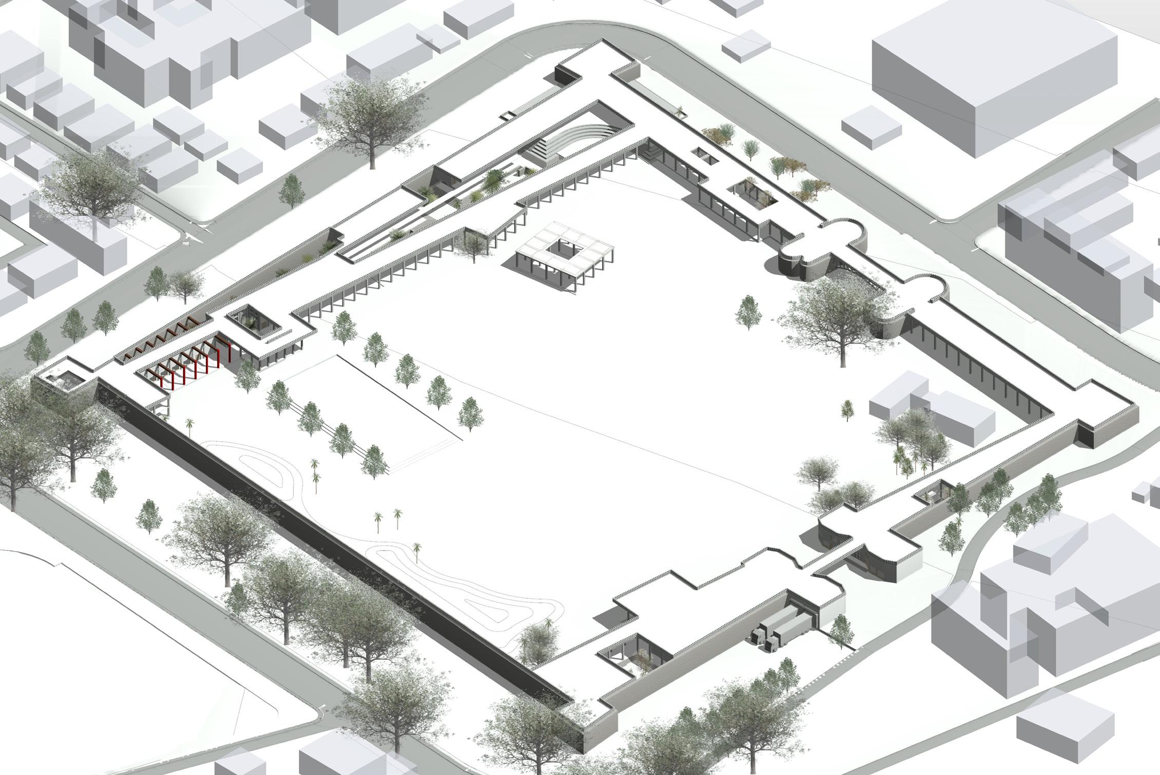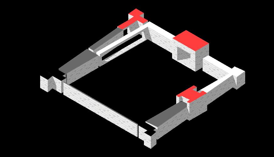 is usually marked by a prominent axis and symmetry, the design starts my trying to correct the geometry of the internal courtyard. The programmatic spaces are poured between the courtyard and the existing fort wall. The fort wall which spans 200m on each side creating linear and dragged out spaces. Four