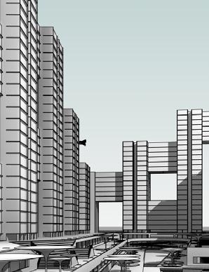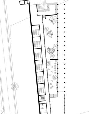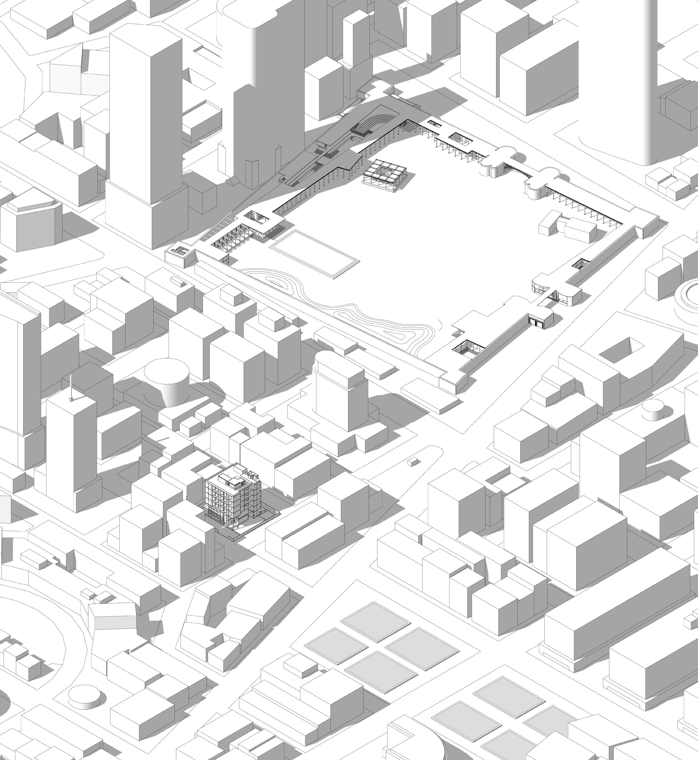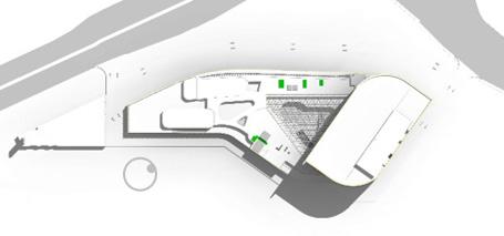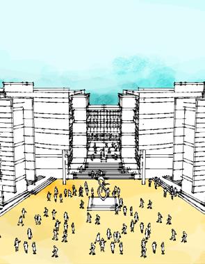 corner towers acts as service cores that takes people up to the terrace creating a walkway on top which helps bring public into the site. The space in between is carved out carefully with help of colonnades, sunken courtyards, and mounds to help improve the experience. Separated walls help create the entrance.