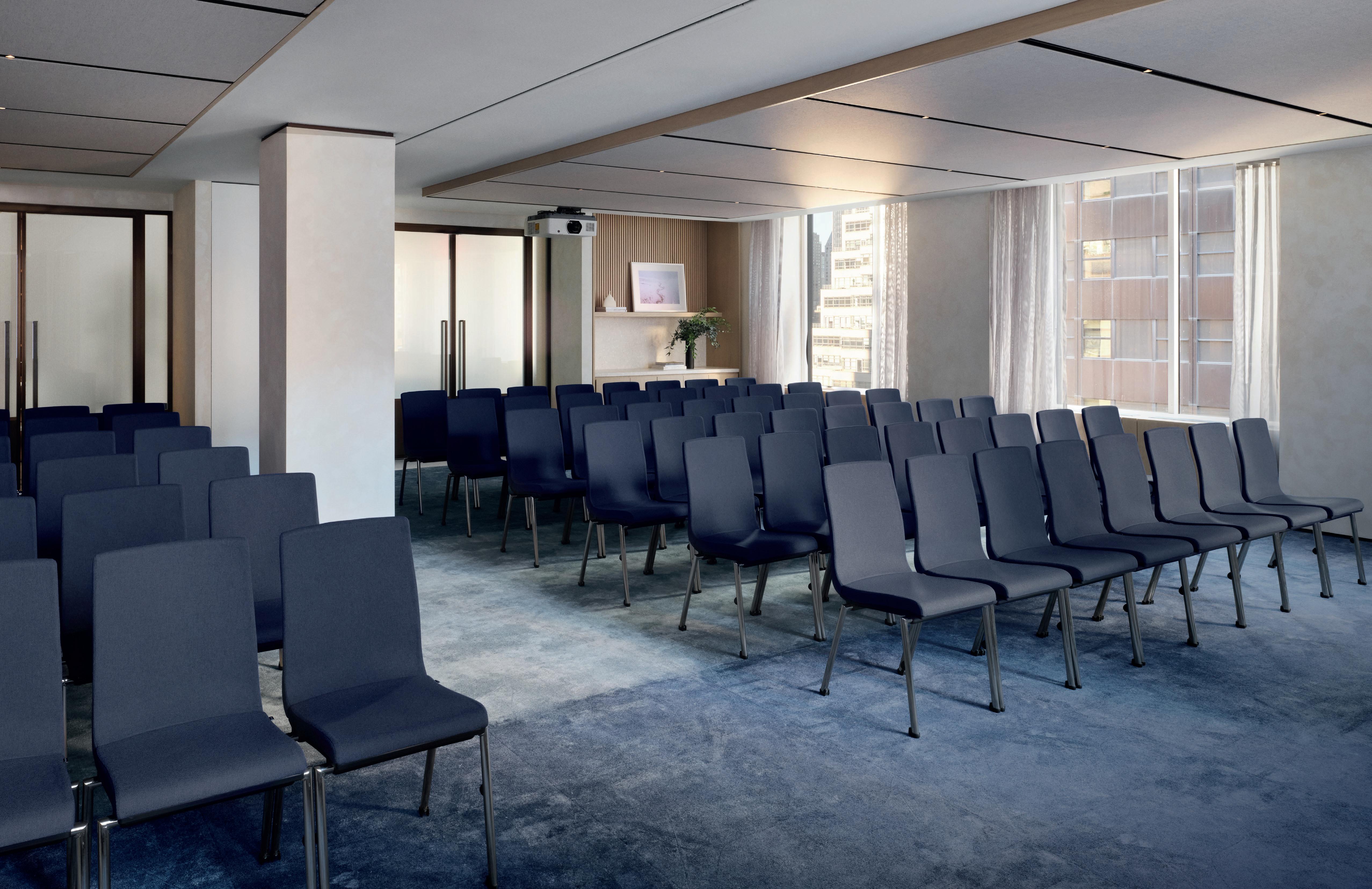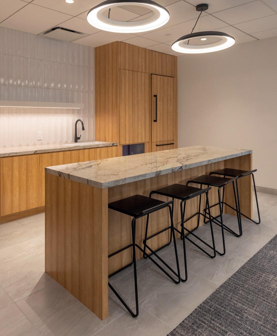 Sage’s Balanced design aesthetic is inspired by 437 Madison Avenue’s traditional and abstract design. The marble-inspired countertops and tile backsplash are paired with muted wood tone cabinetry. The Balanced design aesthetic also features a clean coffered ceiling with a pendant lighting concept, bringing the ultimate balance for productivity and serenity. Additionally, the private offices’ storefront glass use a divided light pattern, which allow the spaces to feel more continuous.