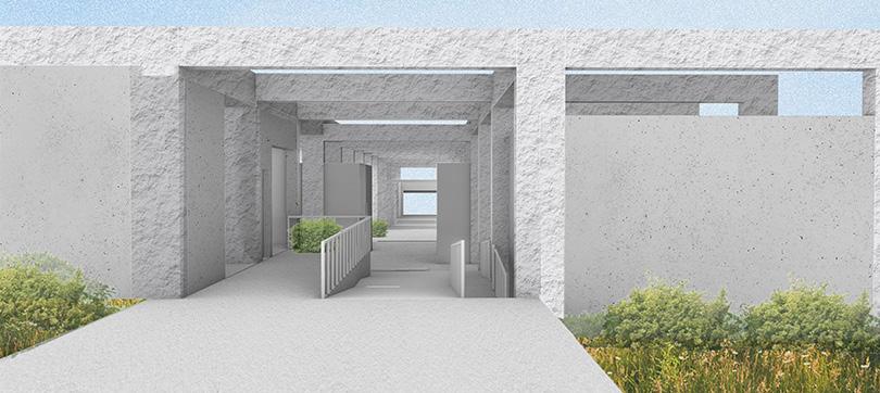 The tectonic system throughout the building consists of layering wave-like transparent walls. This is used to organize the interior spaces, separating the private and the public spaces, while also engaging with the rigid edge in the site. With larger curves in the front facade of the project, it allows for the interior environment to open up to the existing site and invite the local community.