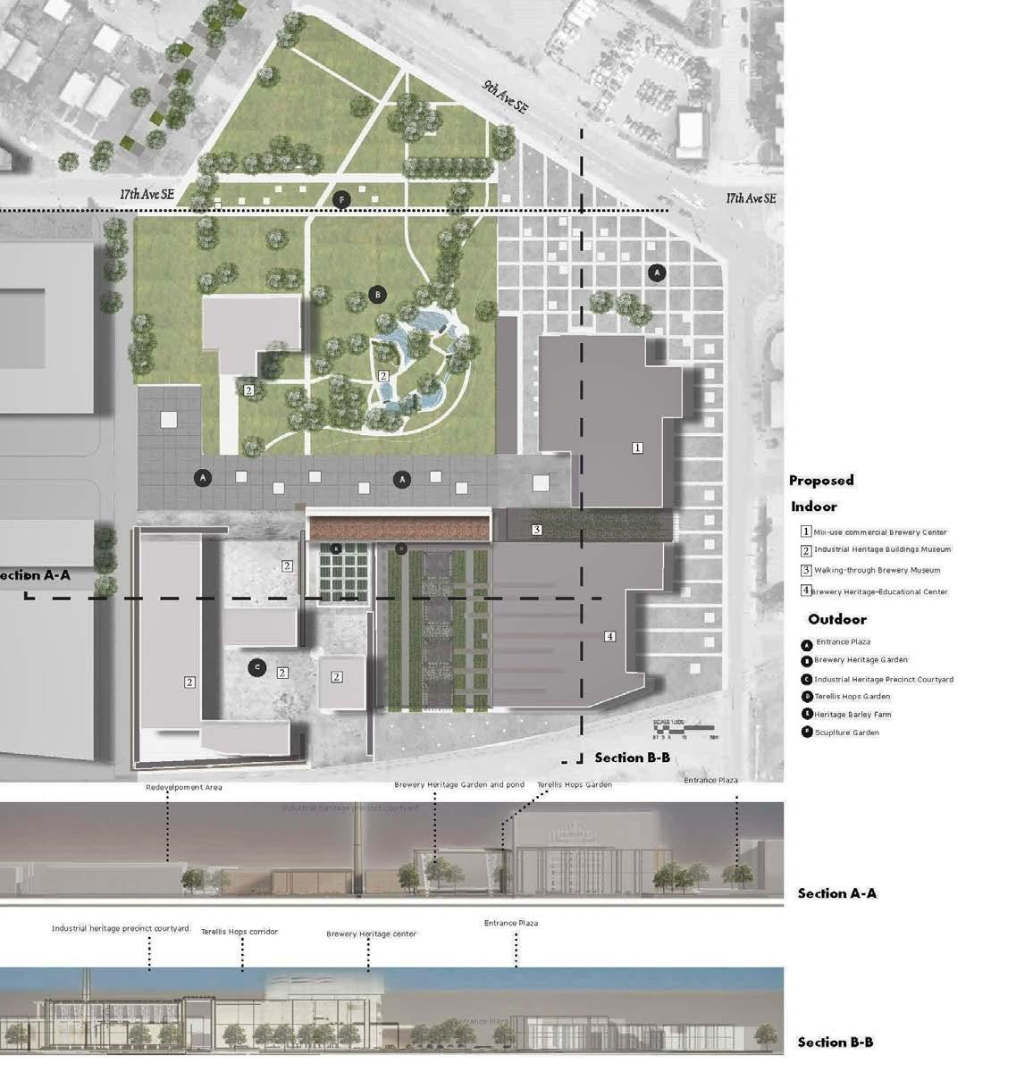 The work focuses on the redevelopment of Inglewood Brewery District. The vision is to give the public and the community the opportunity to reconnect with an old Calgary landmark, bringing it back to life, while also encouraging the further development of a walkable community. The idea is to integrate, develop and interlink the existing patterns that are formed by its previous industrial use, and to find a new interpretation with a new syntax.The landscape oriented transformation plan is set the framework to create an urban destination that is dynamic and engaging for generations to come through, to create a strong sense of identity. The Brewery Garden with its iconic and historical bronze statues, as a symbol of the Calgary Brewery Company,1930’s, mediates a system of new and refurbished connections between old picturesque garden, and new proposed site features.