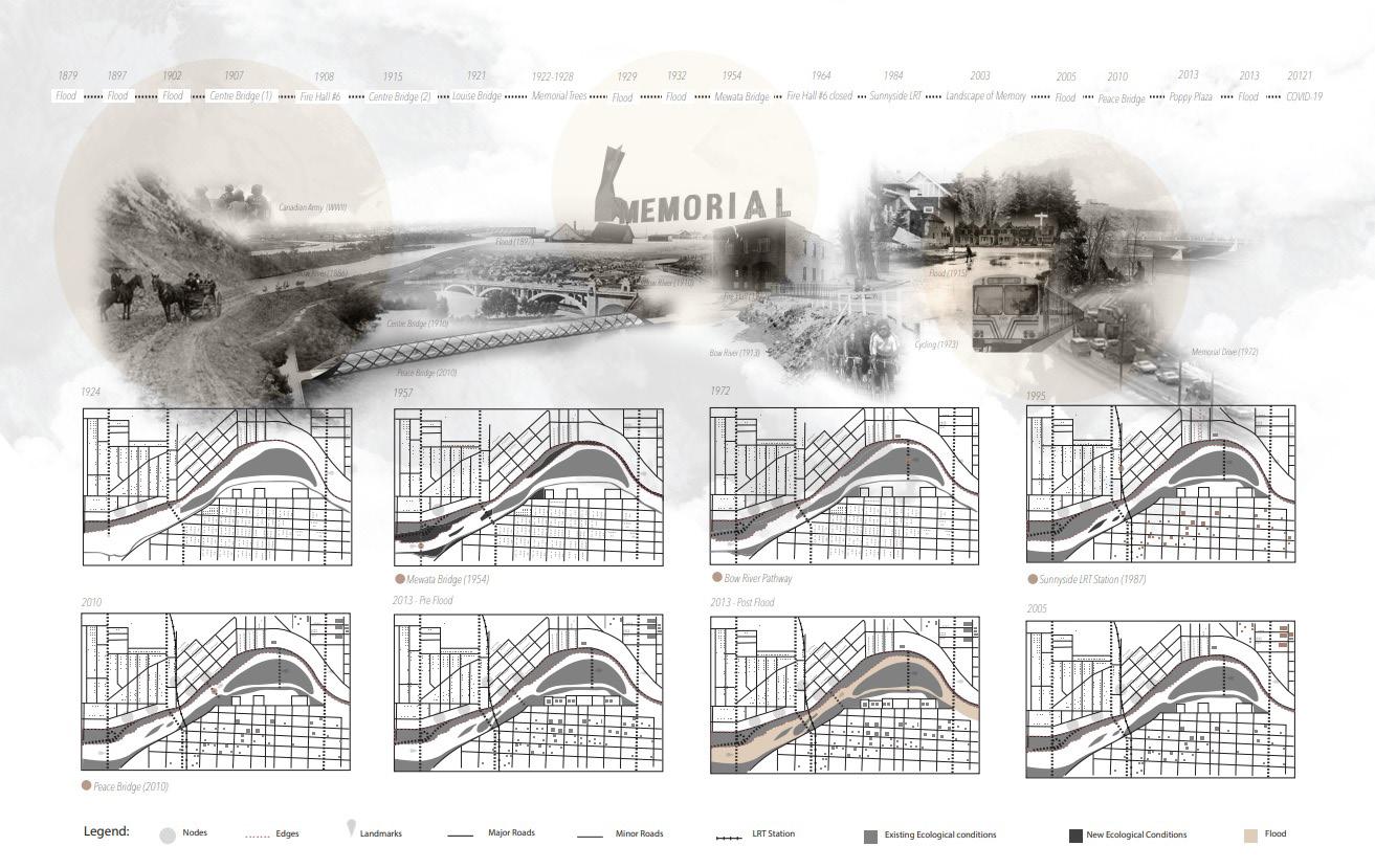 The Memorial Drive corridor along the Bow River is a unique urban landscape that requires immediate attention. The goal is to assess the quality of space along the Bow River and recommend the top five locations to access the river’s edge. Landing and reading the landscape begins with analysing the structure of a spatial layout, employing appropriate urban design elements (district-edge-pathnode-landmarks), and the observer’s characteristics. A journey through memory, infrastructure, environment, and recreation that understands, analyses, or evaluates both the space and the observer’s characteristics. The aim is to create a transformative vision of all the underutilised spaces into a thriving riverfront that can offer the adjacent community a new set of potential activities to engage in.