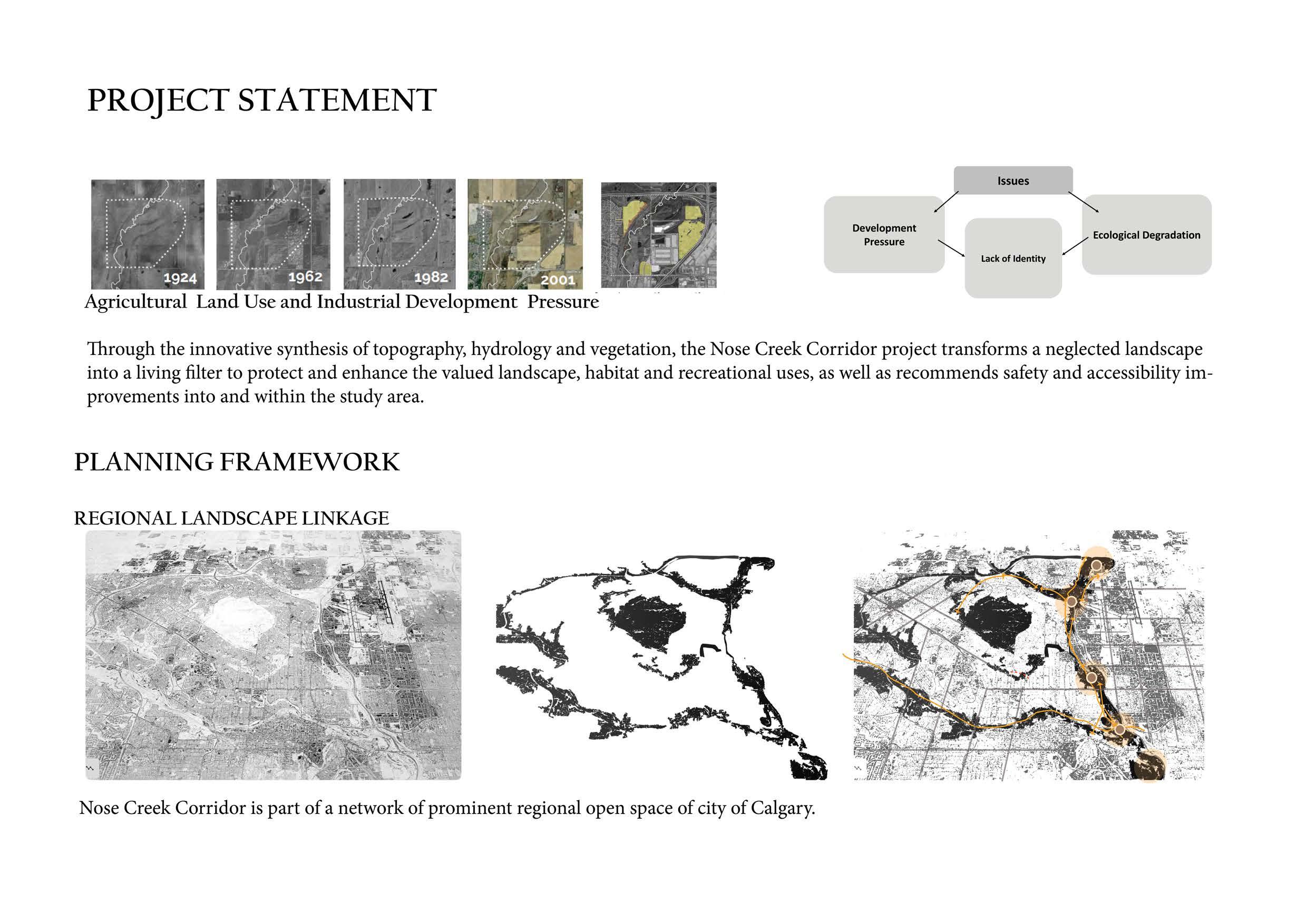 While Nose Creek is included in Calgary’s ambitious park master plan (1991), proposed connecting the riverfront and riparian areas as a park system/network to ensure the connectivity and integrity of the city’s landscape/green open spaces has been neglected despite having immense potential and stunning natural surroundings.The critical solution is to take a holistic landscape architectural design approch both at the regional (city-wide) and neighbourhood scales to improve the spatial quality of our creek systems. As a first step, developing a strategic comprehensive greenway networks can integrate Nose Creek into Calgary’s ecological network and park systems. These systems are healthy, connected, and resilient and provide citizens with equitable and appropriate access to nature.