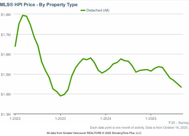 The detached‑home benchmark in the broader Fraser Valley area (which includes Surrey) is showing continued monthly declines, driven by elevated inventory and cautious buyer sentiment.