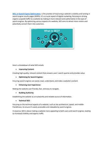 SEO, or Search Engine Optimization, is the practice of improving a website's visibility and ranking in search engine results pages (SERPs). It's a crucial aspect of digital marketing, focusing on driving organic (unpaid) traffic to a website by making it more relevant and authoritative in the eyes of search engines. By optimizing various aspects of a website, SEO aims to attract more visitors and potentially convert them into customers.
