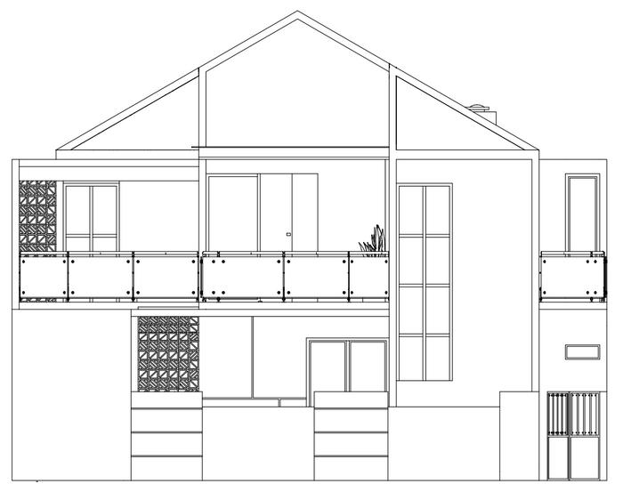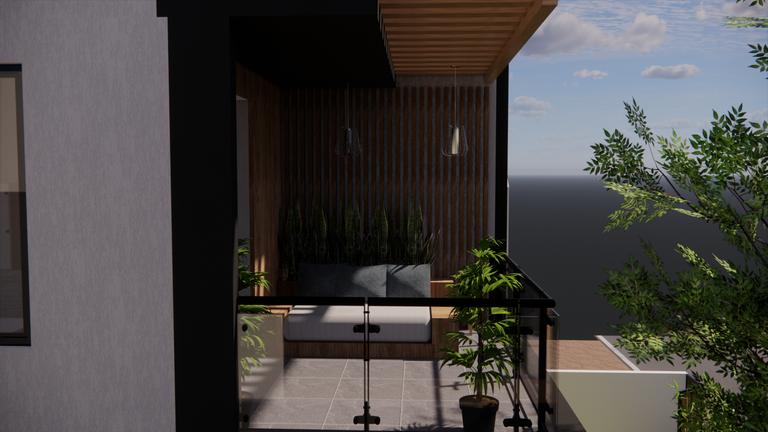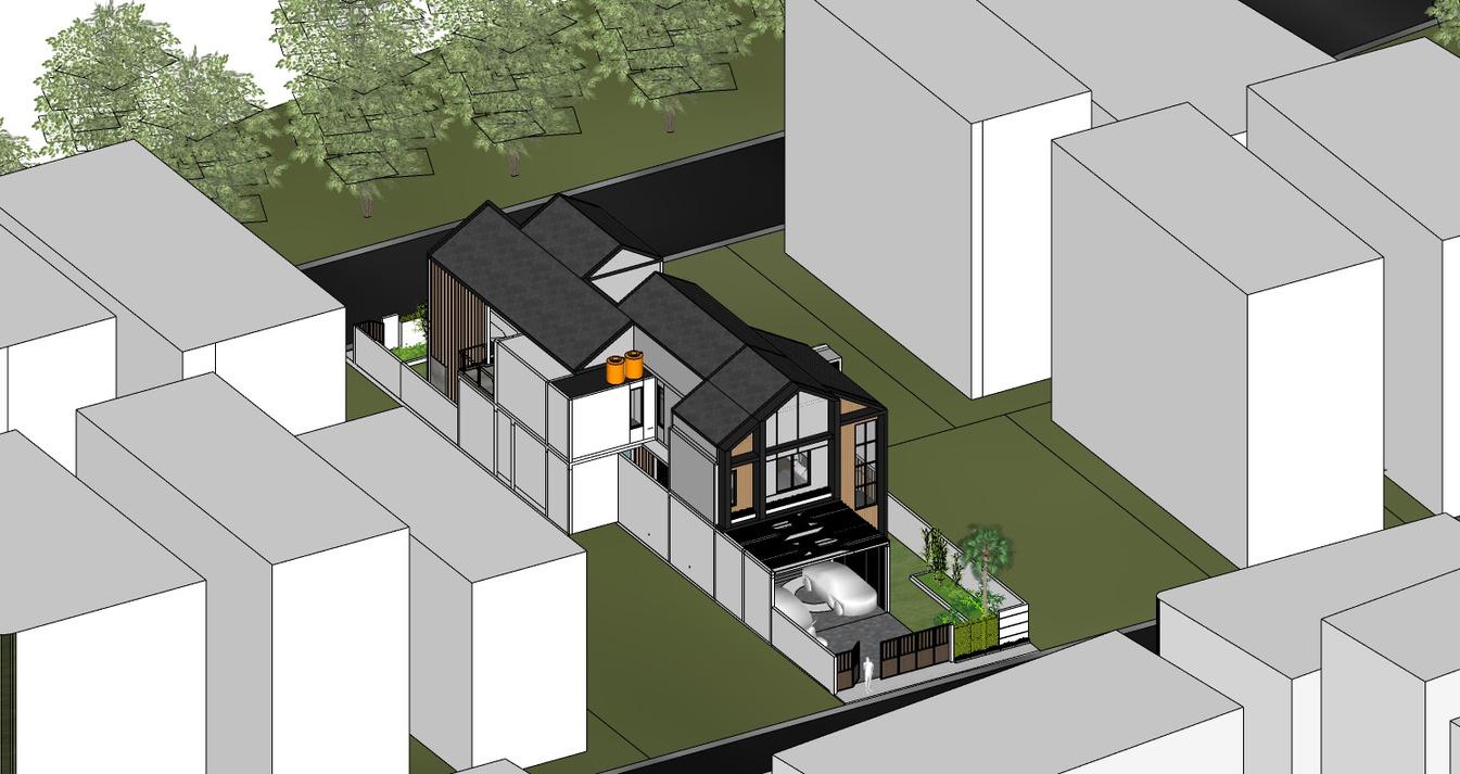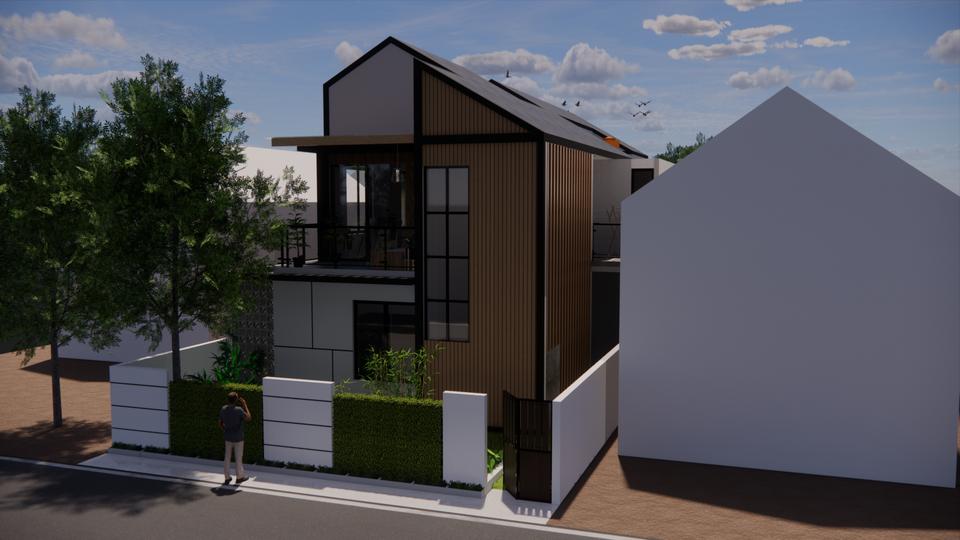 Berikut merupakan konsep modern tropis pada bagian ekterior yang di terapkan pada rumah tinggal tersebut, yaitu : Pada bagian fasad menggunakan pada atap yang memiliki bentuk miring, Fungsinya untuk melindungi bangunan dari cahaya matahari langsung atau terpaan hujan deras. Biasanya atap miring memiliki skala kemiringan 30 derajat.