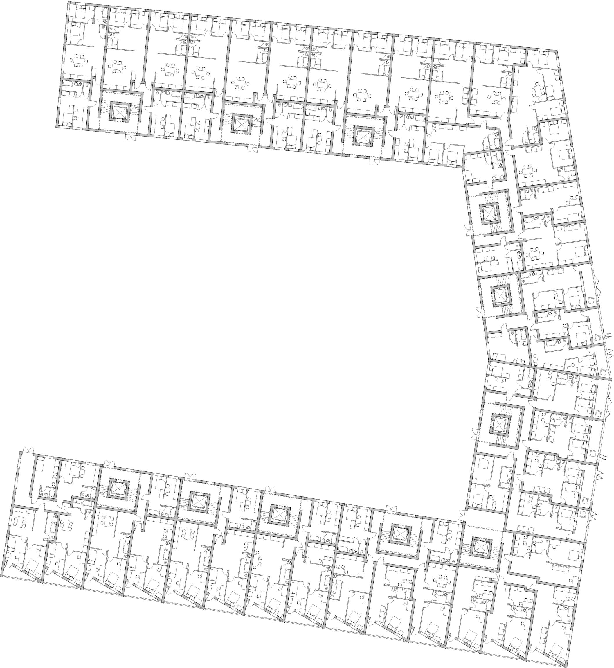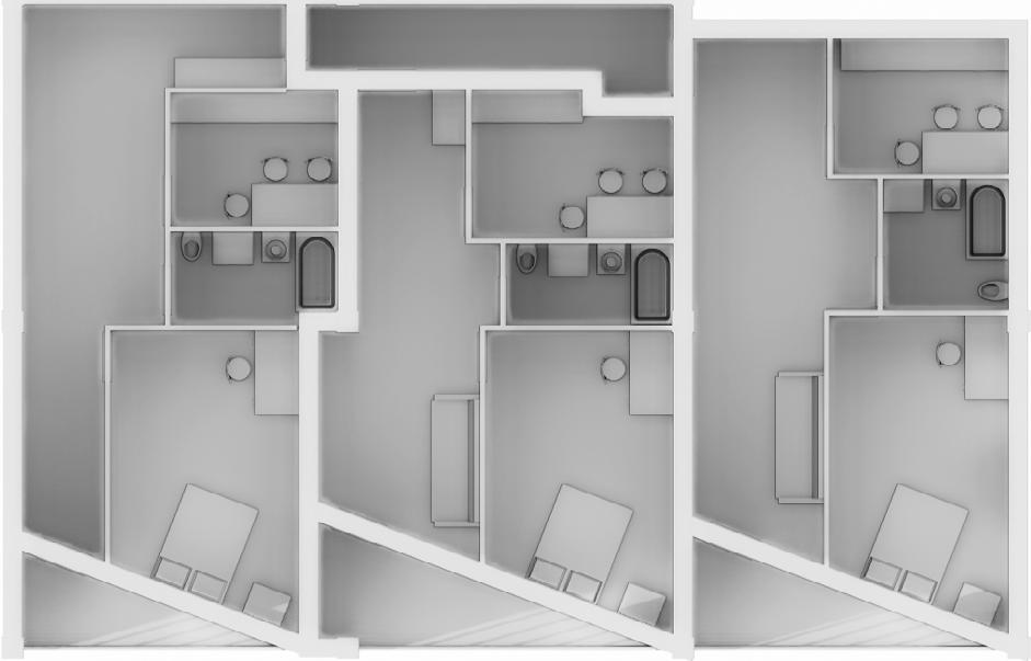 Ein Teil des Gebäudes wurde als „Stufen“ gestaltet, um sicherzustellen, dass er den anderen Teil des Gebäudes nicht von der Sonne abschattet. Die Wohnräume sind näher zur sonnigen Seite, während die nicht Wohnräume tiefer in der Wohnung liegen.