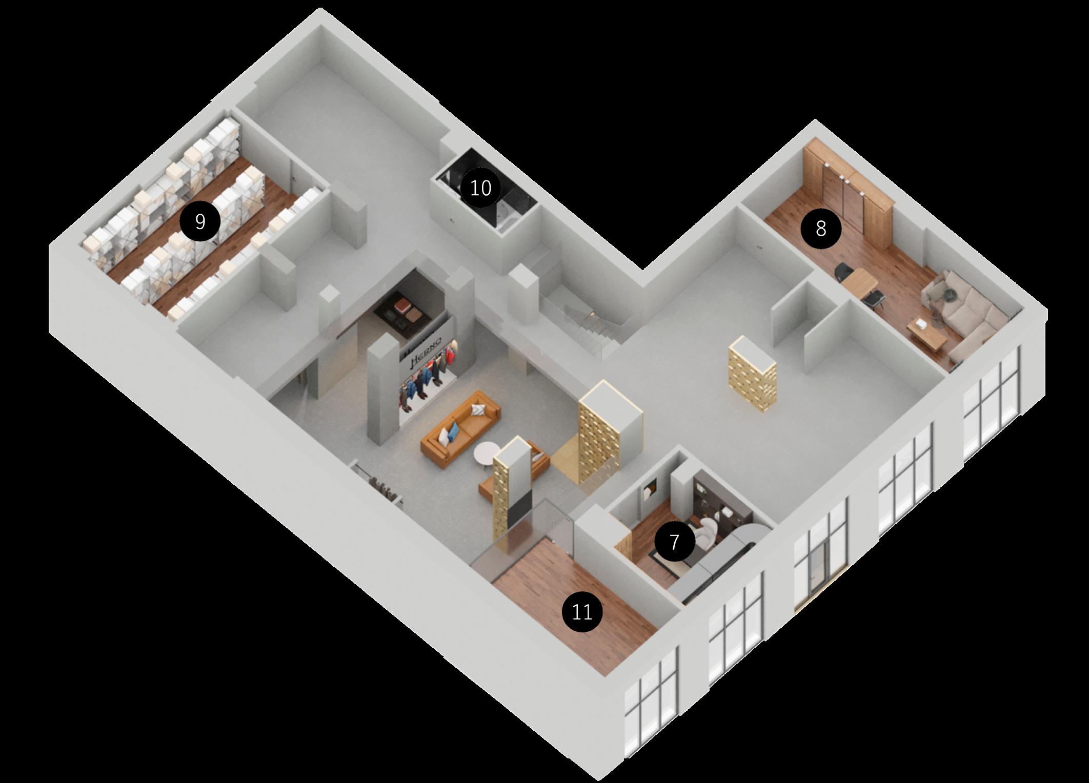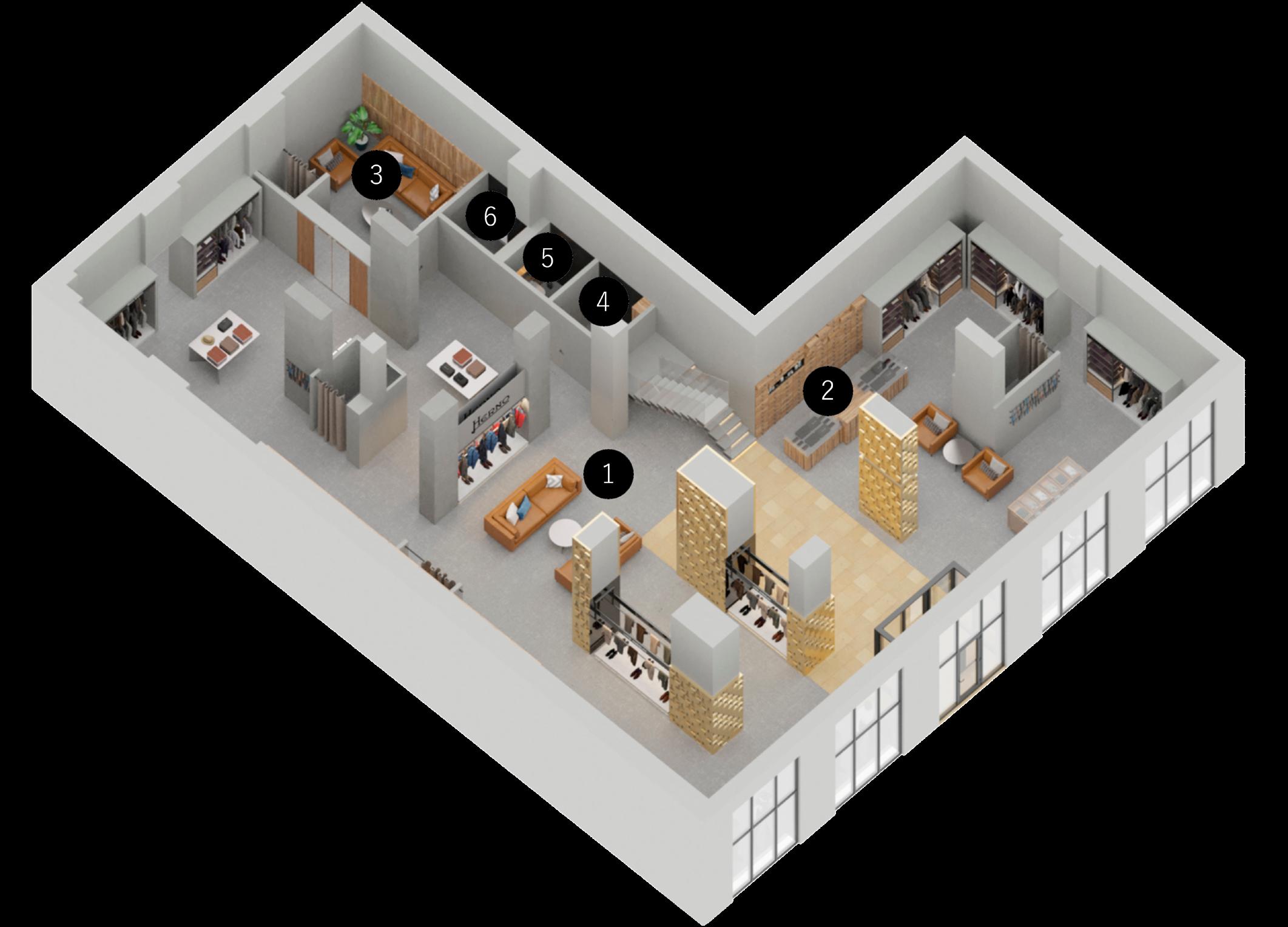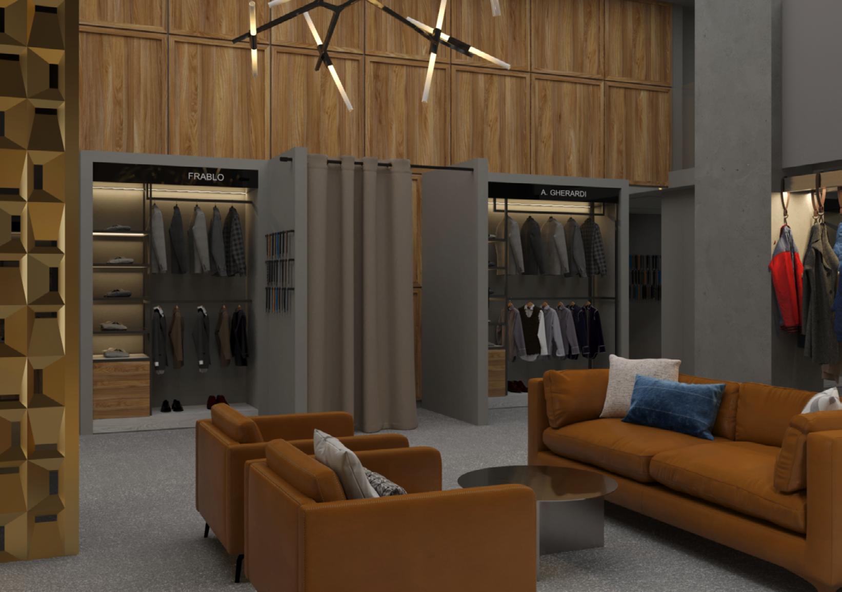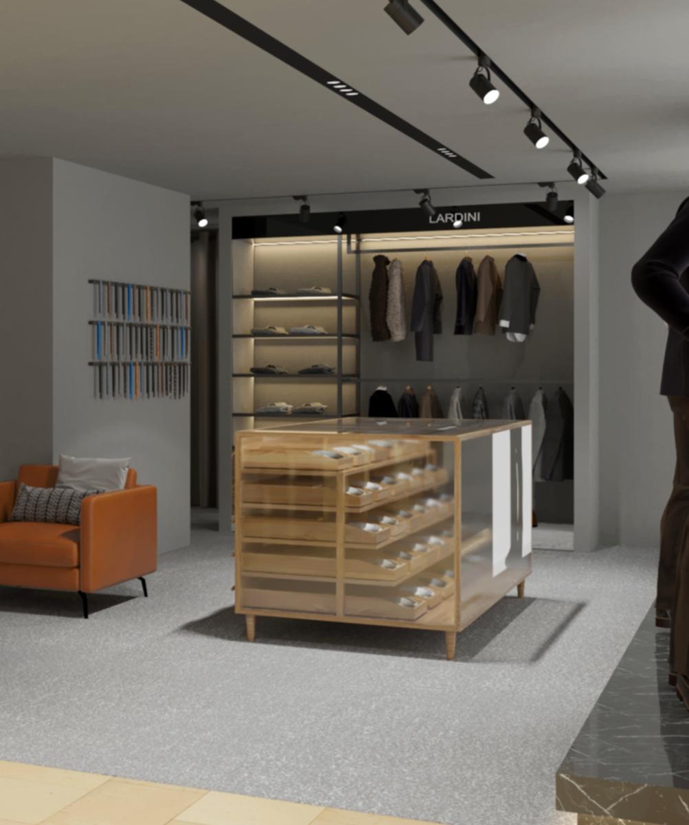 Die Anwesenheit eines VIP-Raums unterstreicht ebenfalls den Luxus und den individuellen Ansatz für jeden Kunden bei der Auswahl der Kleidung. Die große Fläche des Geschäfts ermöglicht die Anordnung einer Vielzahl von Ständern für Bekleidung und bietet eine große Auswahl an einzelnen Kleidungsstücken.