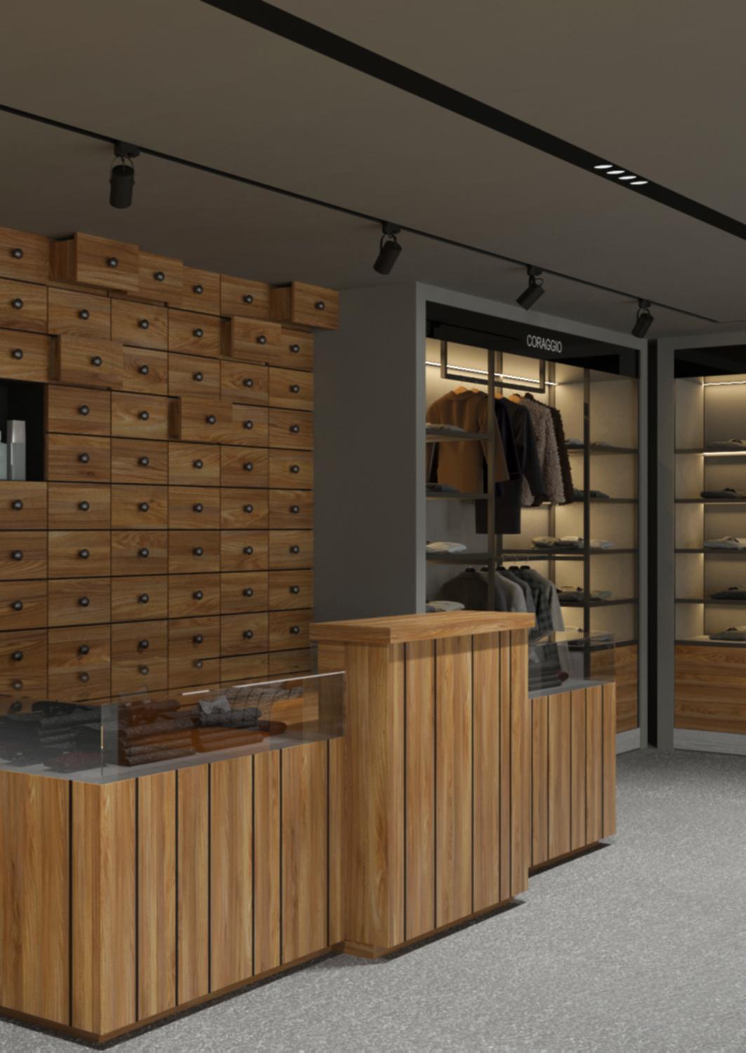 Das Design des klassischen Herrenbekleidungsgeschäfts in Astana wurde unter Berücksichtigung aller funktionalen und stilistischen Wünsche des Kunden entworfen. Messingpaneele, Holzelemente, Ledermöbel und gedämpfte Beleuchtung – alles wurde darauf ausgelegt, das Gefühl eines luxuriösen Herrenbekleidungsgeschäfts zu schaffen.