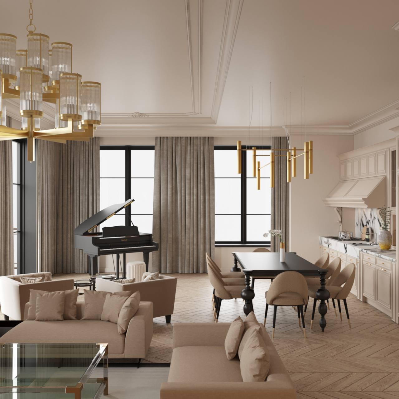 210 m² große Wohnung für eine fünfköpfige Familie, gelegen in einem luxuriösen Viertel von Almaty, Kasachstan. Die Auswahl der Farben, des Stils, der Funktionalität und der Bedürfnisse des Kunden wurde sorgfältig getroffen, um ein komfortables, luxuriöses und elegantes Zuhause zu schaffen.