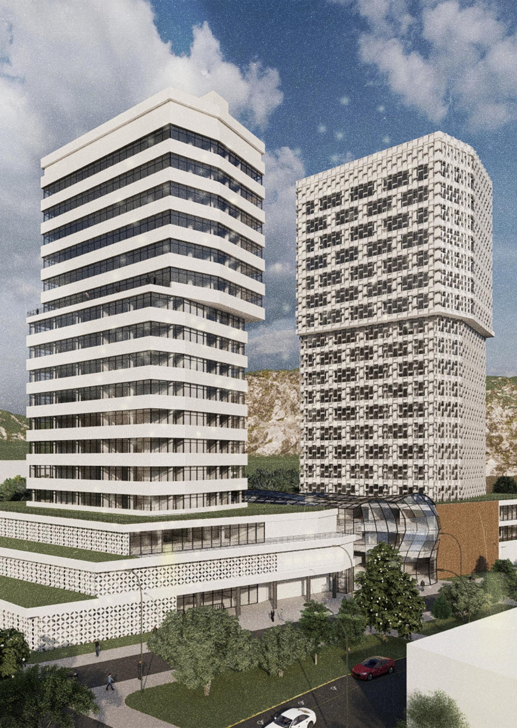 Beide Türme wurden in unterschiedlichen Stilen entworfen, um den früheren sowjetischen Architekturstil (linker Turm) und den zeitgenössischen Stil (rechter Turm) darzustellen.