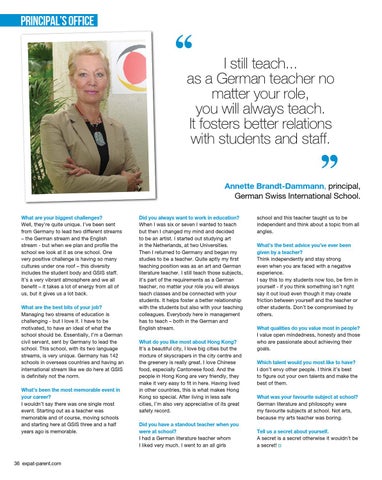 I still teach... as a German teacher no matter your role, you will always teach. It fosters better relations with students and staff. Annette Brandt-Dammann, principal, German Swiss International School. What are your biggest challenges? Well, they’re quite unique. I’ve been sent from Germany to lead two different streams – the German stream and the English stream - but when we plan and profile the school we look at it as one school. One very positive challenge is having so many cultures under one roof – this diversity includes the student body and GSIS staff. It’s a very vibrant atmosphere and we all benefit – it takes a lot of energy from all of us, but it gives us a lot back. What are the best bits of your job? Managing two streams of education is challenging - but I love it. I have to be motivated, to have an ideal of what the school should be. Essentially, I’m a German civil servant, sent by Germany to lead the school. This school, with its two language streams, is very unique. Germany has 142 schools in overseas countries and having an international stream like we do here at GSIS is definitely not the norm. What’s been the most memorable event in your career? I wouldn’t say there was one single most event. Starting out as a teacher was memorable and of course, moving schools and starting here at GSIS three and a half years ago is memorable.