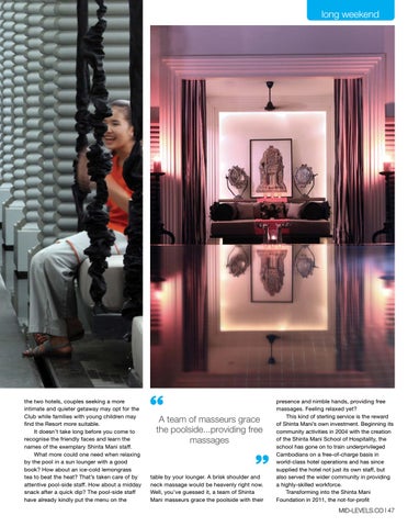 presence and nimble hands, providing free massages. Feeling relaxed yet? This kind of sterling service is the reward of Shinta Mani’s own investment. Beginning its community activities in 2004 with the creation of the Shinta Mani School of Hospitality, the school has gone on to train underprivileged Cambodians on a free-of-charge basis in world-class hotel operations and has since supplied the hotel not just its own staff, but also served the wider community in providing a highly-skilled workforce. Transforming into the Shinta Mani Foundation in 2011, the not-for-profit