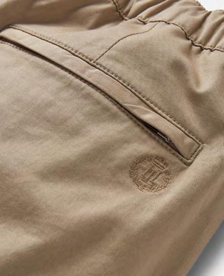 These trousers feature a garment dyed finish, half elasticated waist at the back, and an internal drawcord for the optimal fit. Functional belt loops, convenient side entry pockets, and a single welt back pocket add practicality. The YKK zipped fly with branded button closure ensures security, while the subtle Laurel and Crown embroidered detail at the back pocket adds a refined touch. These trousers blend comfort and style, making them an excellent choice for both casual and smart-casual occasions.