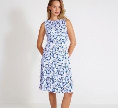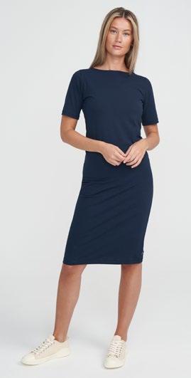 ASTA MID LENGTH DRESS S42607 Col. Navy, Coral Pink, Surf Blue/White, Sandshell/White, Sand/Navy. 93% Viscose, 7% Elastane. Size XS-XL