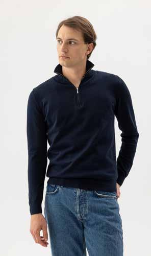 Patent knitted T-neck in certified cotton. 7 gauge. This high twisted crépe quality offers a dry and summery handfeel. YKK metal zip at high, rib knitted T-neck. Ribknit hems. Regular fit.