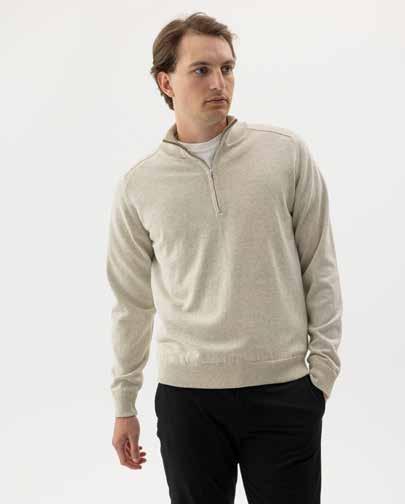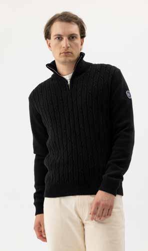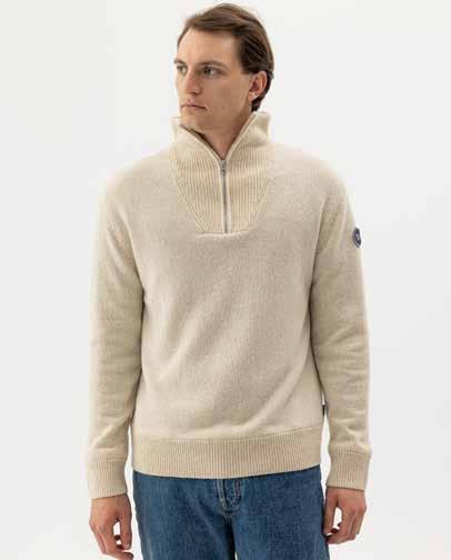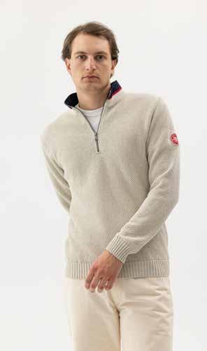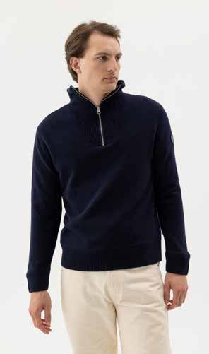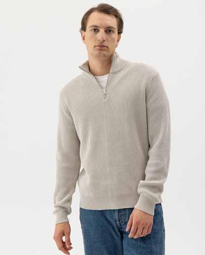 T-neck in structure knitted cotton. 7 gauge. Woven fabric around top of neck with seam in contrasting colour. YKK zip at neck. Woven windproof lining. Regular fit.