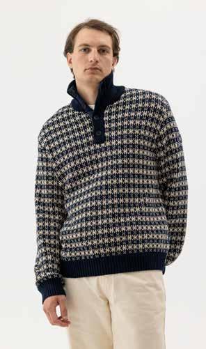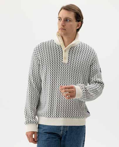 Jaquard knitted T-neck in organic cotton. 5 gauge. High, ribbed collar and woven herringbone tape inside placket. Colour matching buttons. Two different patterns. Woven windproof lining. Regular fit.