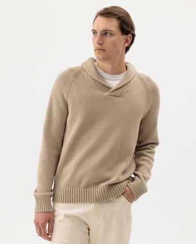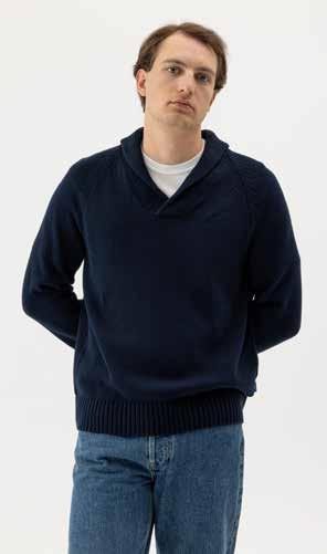 Flat knitted sweater in organic cotton. 5 gauge. Rib knitted shawl collar. Raglan sleeve with fully fashion details along seam. Regular fit.