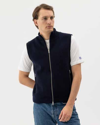 Double face knitted vest in 80% wool and 20% polymide blend. 7 gauge. High rib knitted collar with cotton inside to prevent itching. Two way YKK metal zip at front. Zipper side pockets. Woven windproof lining. Regular fit.