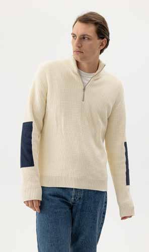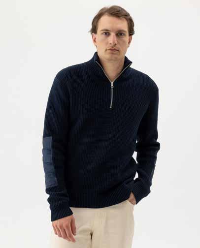Structure knitted T-neck in organic cotton. 7 gauge. Stretchy woven patches at elbow. Rib knitted collar and YKK metal zip at front. Woven windproof lining. Regular fit.