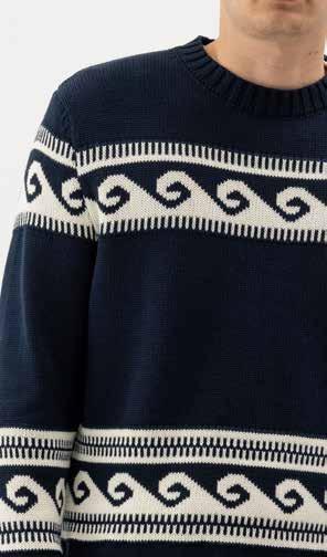 Jacquard knitted crew neck in organic cotton. 5 gauge. Heavy knitted sweater with summery wave pattern at chest and bottom part. Ribknit hems. Regular fit.
