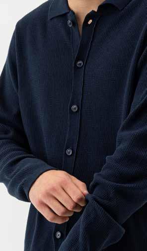 Structure knitted shirt in organic cotton. 12 gauge. Polo collar and colour matching buttons at front placket. Tubular knitted endings. Wear alone, or wear unbuttoned over your favourite tees. Regular fit