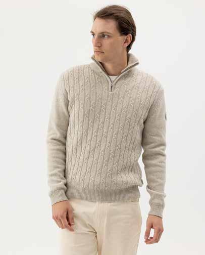 T-neck knitted in soft cashmere and merino wool blend. 5 gauge. Cabel structure at front, and high, rib knitted collar with YKK metal zip. Ribbed trims. Woven windproof lining. Regular fit.