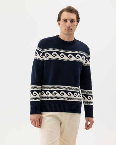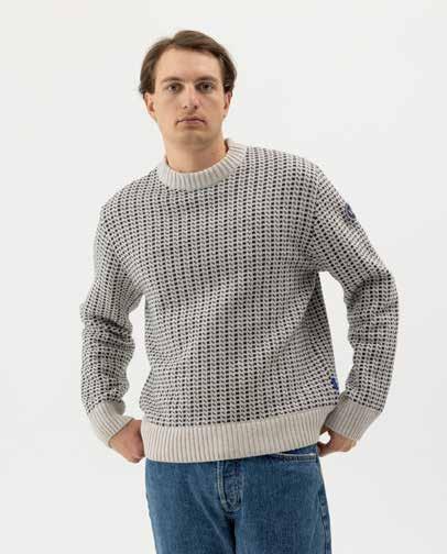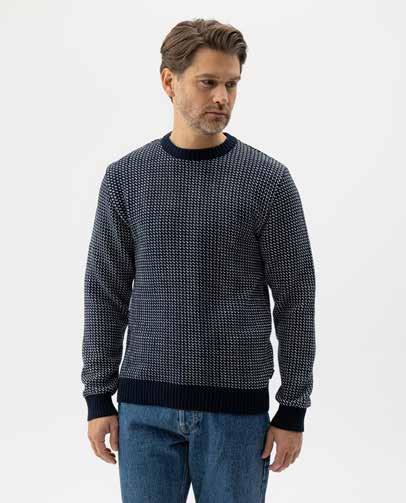 Jacquard knitted crew neck in organic cotton. 5 gauge. Traditional pattern and rib knitted hemlines. This classic style has a regular fit and works perfect for both men and women as a unisex style.