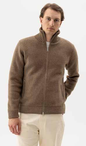 Double face knitted jacket in 80% wool and 20% polymide blend. 7 gauge. High, rib knitted collar with cotton inside to prevent itching. Two way YKK metal zip at front. Zipper side pockets. Woven windproof lining. Regular fit.