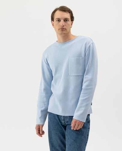 Milano knitted sweater in organic cotton. 12 gauge. Slightly boatneck with thin tubular. One knitted chest pocket. Raw endings and small slits at sides. Regular fit.