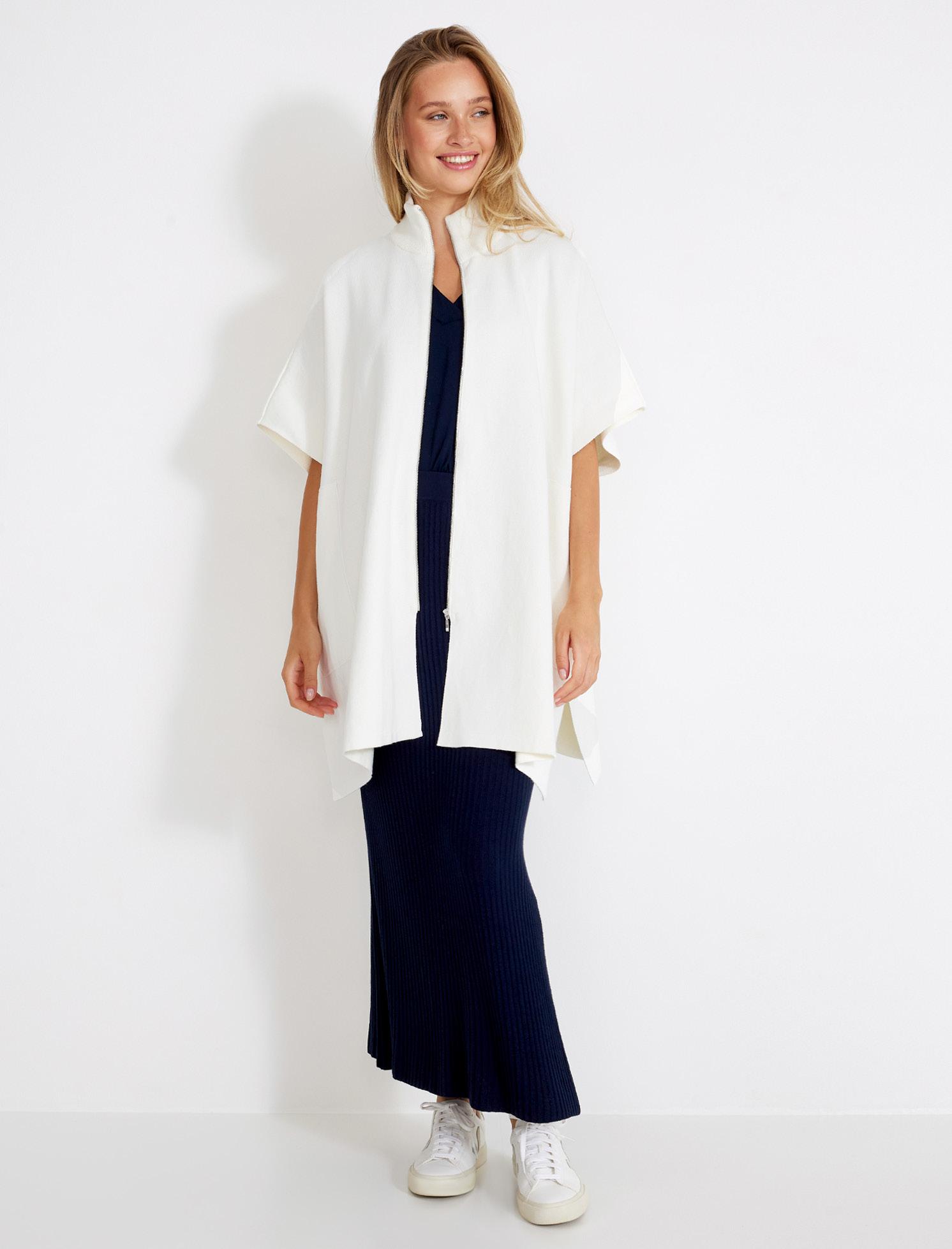Milano knitted poncho with rib knitted collar. Zip and 2 frontpockets. High slit at sides.