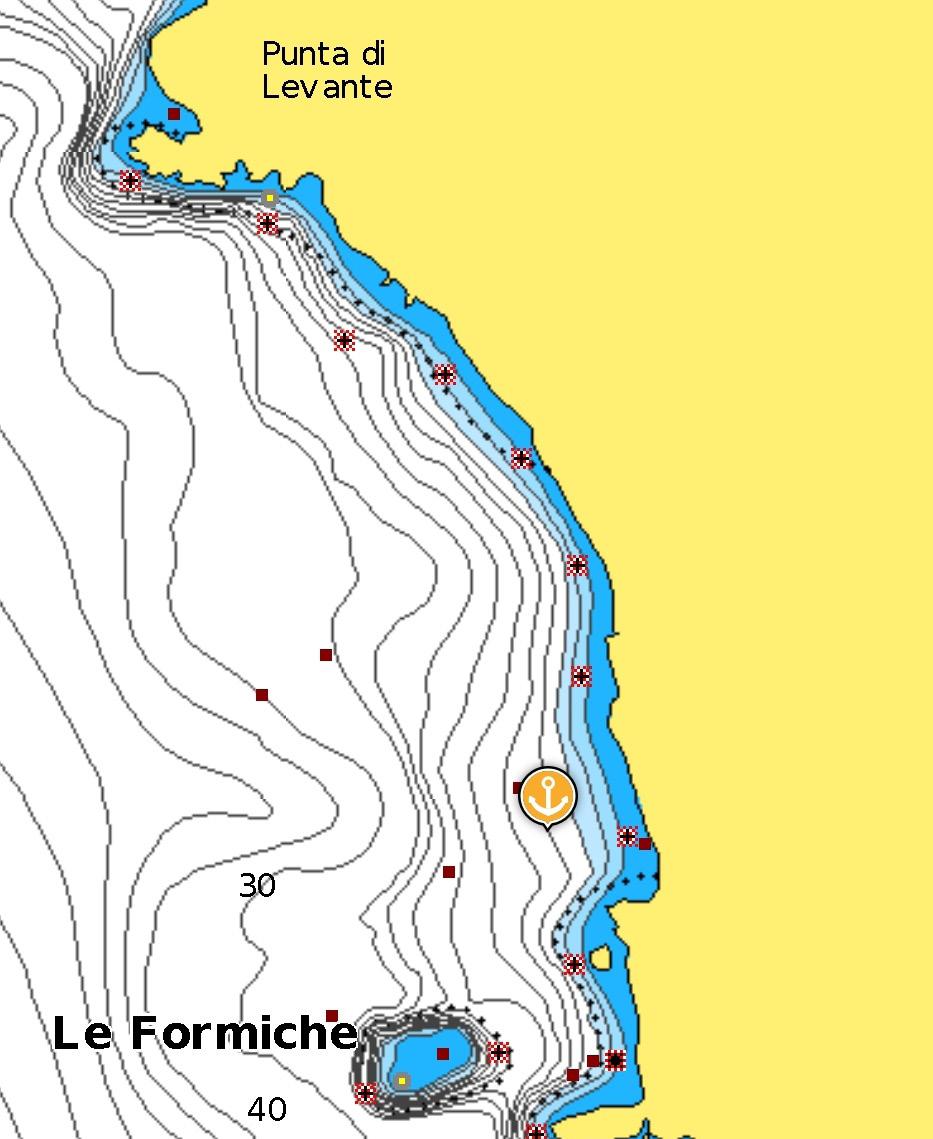 On the north-eastern side of the island is the main town. Here it is possible to anchor on a mixed bed of sand and stones between 5 and 12 metres. Otherwise, it is safer, given the island’s shape, to moor at one of the many buoys (Marina del Gabbiano) in front of the beach at Punta Lena.