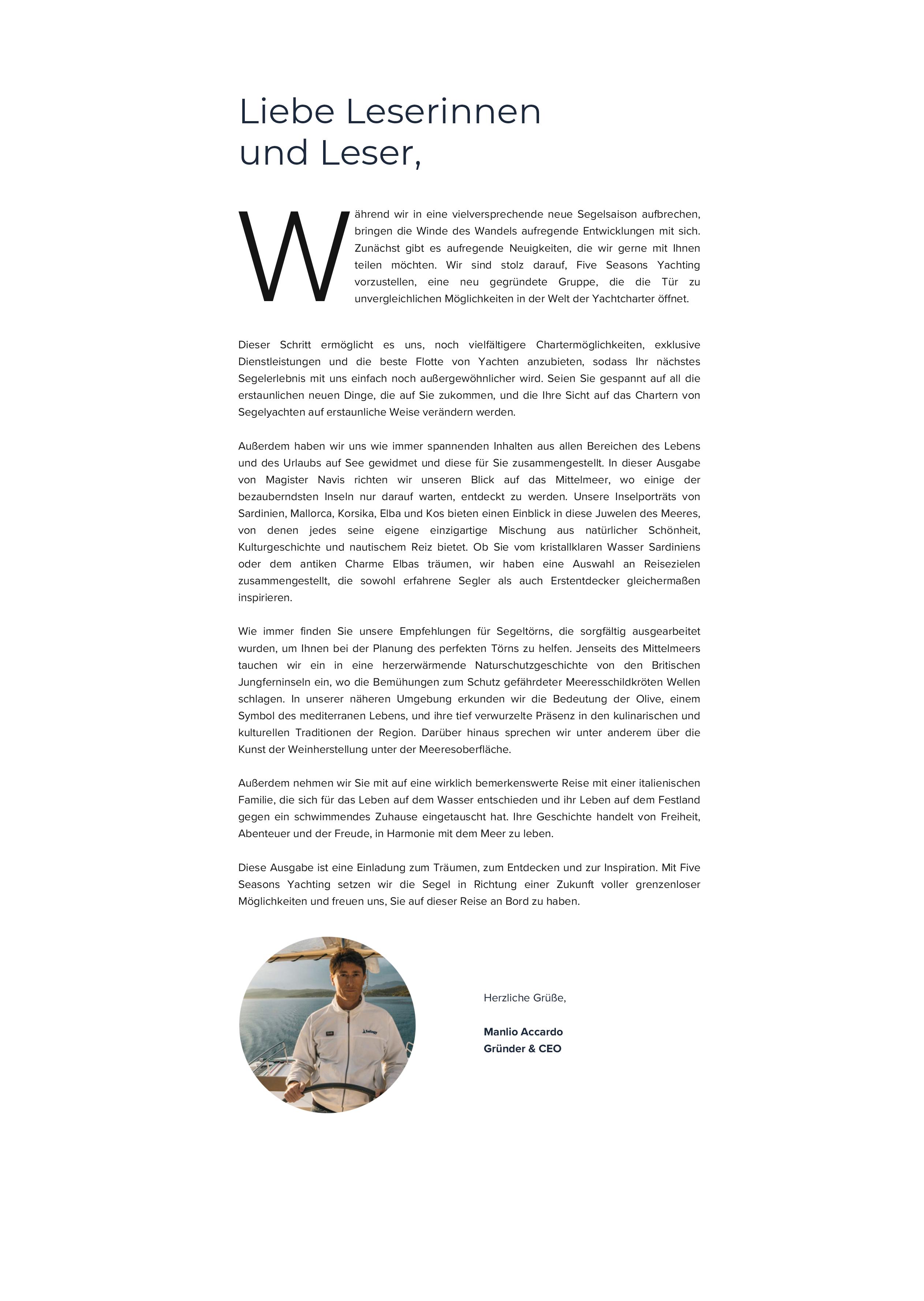 Wir freuen uns, Ihnen Five Seasons Yachting vorzustellen – eine visionäre Gruppe, die Yachtcharter mit exklusiven Routen, luxuriösen Flotten und unvergleichlichem Service neu definiert und eine neue Ära unvergesslicher Segelabenteuer einläutet.
