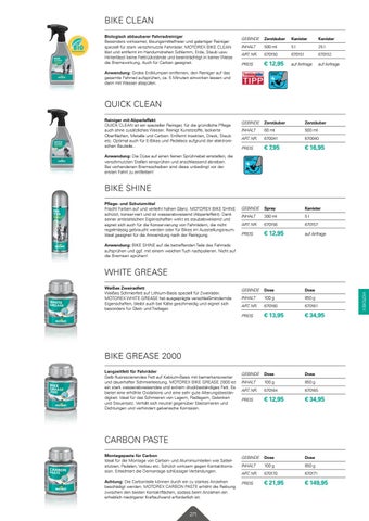 BIKE CLEAN Biologisch abbaubarer Fahrradreiniger Besonders wirksamer, lösungsmittelfreier und gelartiger Reiniger speziell für stark verschmutzte Fahrräder. MOTOREX BIKE CLEAN löst und entfernt im Handumdrehen Schlamm, Erde, Staub usw. Hinterlässt keine Fettrückstände und beeinträchtigt in keiner Weise die Bremswirkung. Auch für Carbon geeignet.