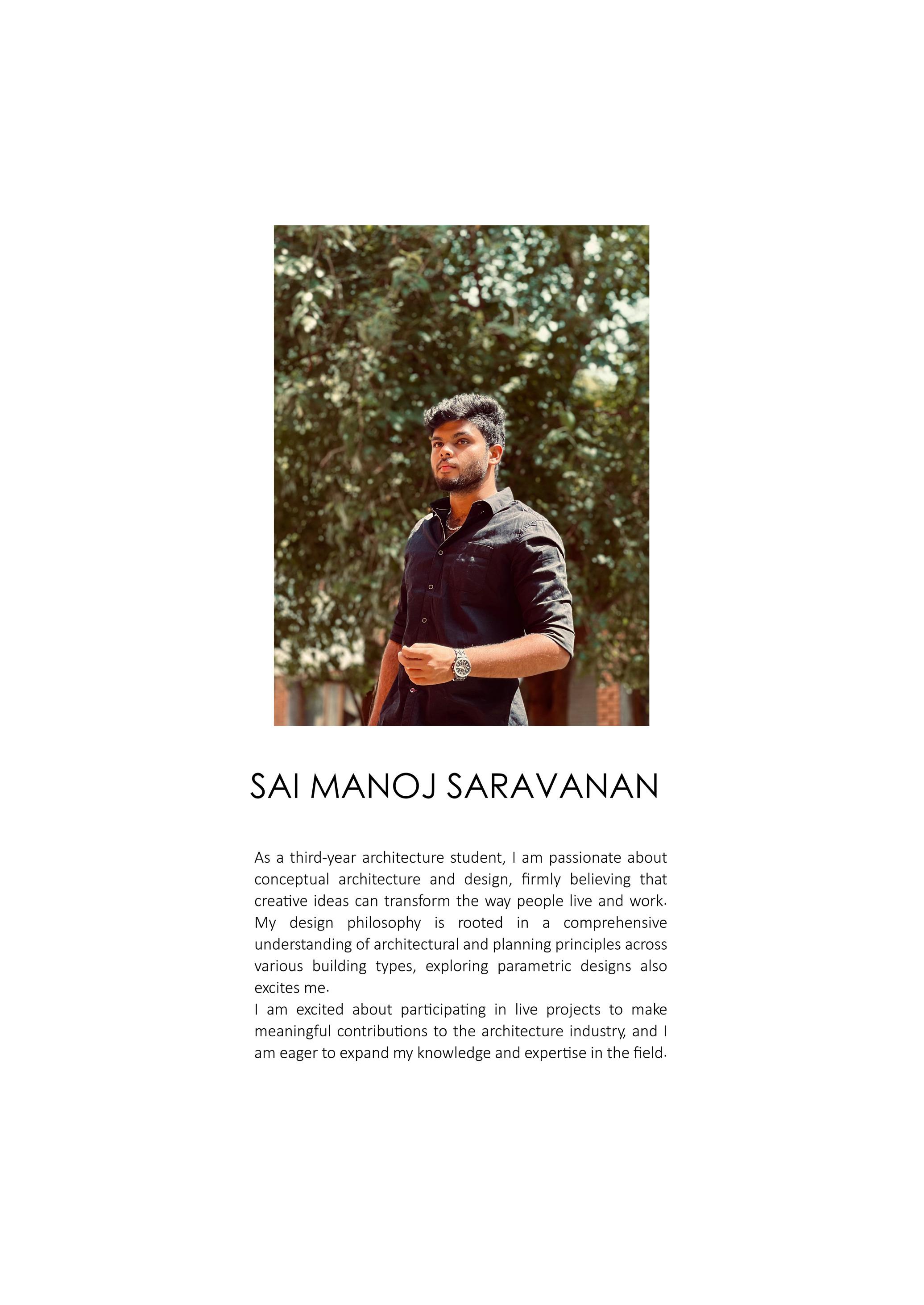 Hi, I'm Sai Manoj S, and I'm excited to present my curated collection of works from 2021 to 2023. My undergraduate portfolio features diverse projects, showcasing my growth as an architect from conceptualization to the final outcome. It reflects my passion, creativity, and dedication towards the field. Thanks for taking the time to view my work.