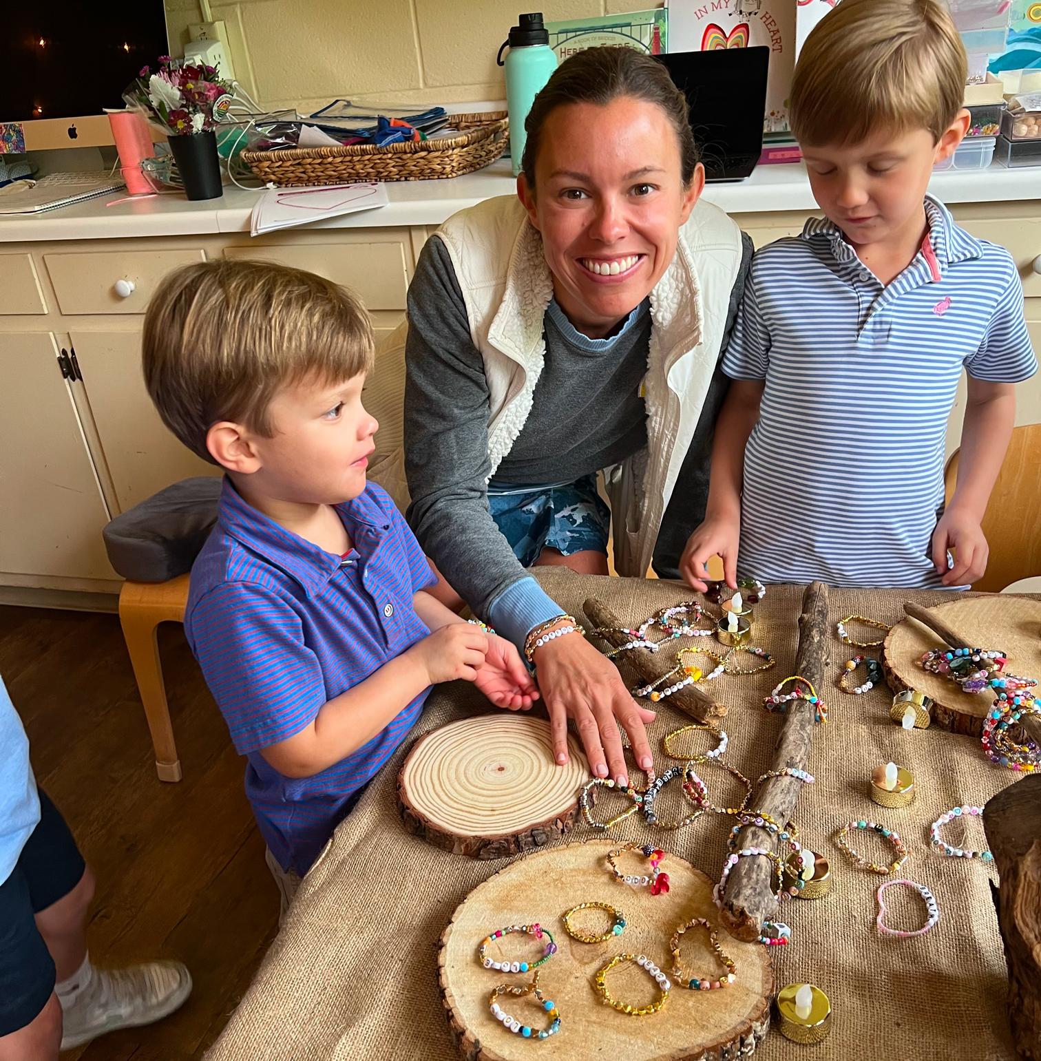 Extending their acts of kindness beyond the classroom, the children determined their class gift to the community -- what have lovingly come to be known as Bridge Bracelets, stretchy jewelry that spread joy. The children brainstormed words of positivity: "peace, love, joy, friendship, lightness, kindness, etc." that were then beaded onto each bracelet. With the help of family, peers, and some neighbors at the Saint Anne's Terrace senior living center, 200 bracelets were created.