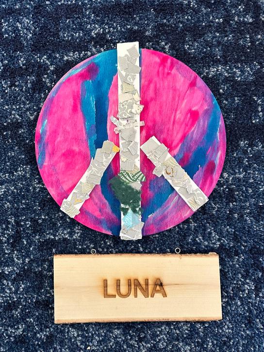 Sun River’s Mixed media peace signs made from various art materials and loose parts.