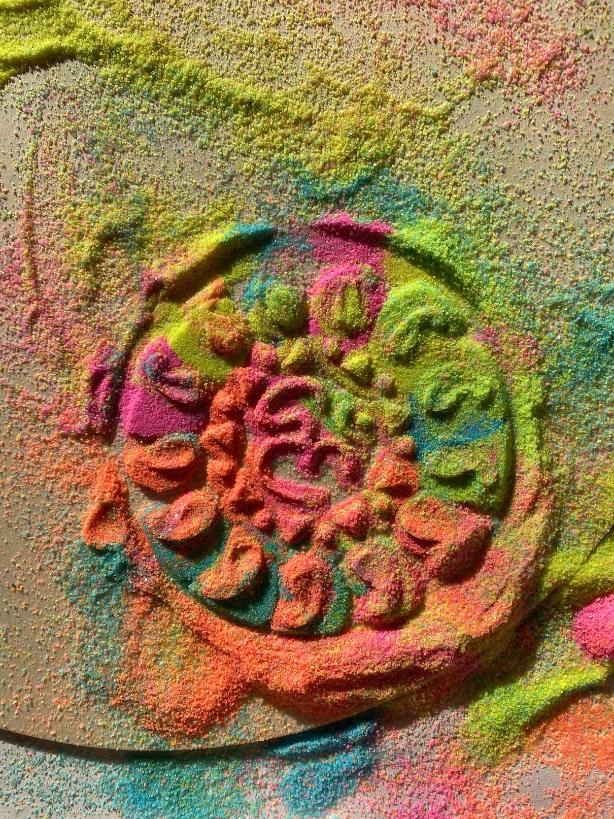 (Clockwise from top left) Happy Diwali! In November, Pre-K’s Window Room celebrated the Festival of Lights by decorating diyas (lights) and creating rangolis (colored sand designs) Friends also shared goodie bags of traditional Indian treats.