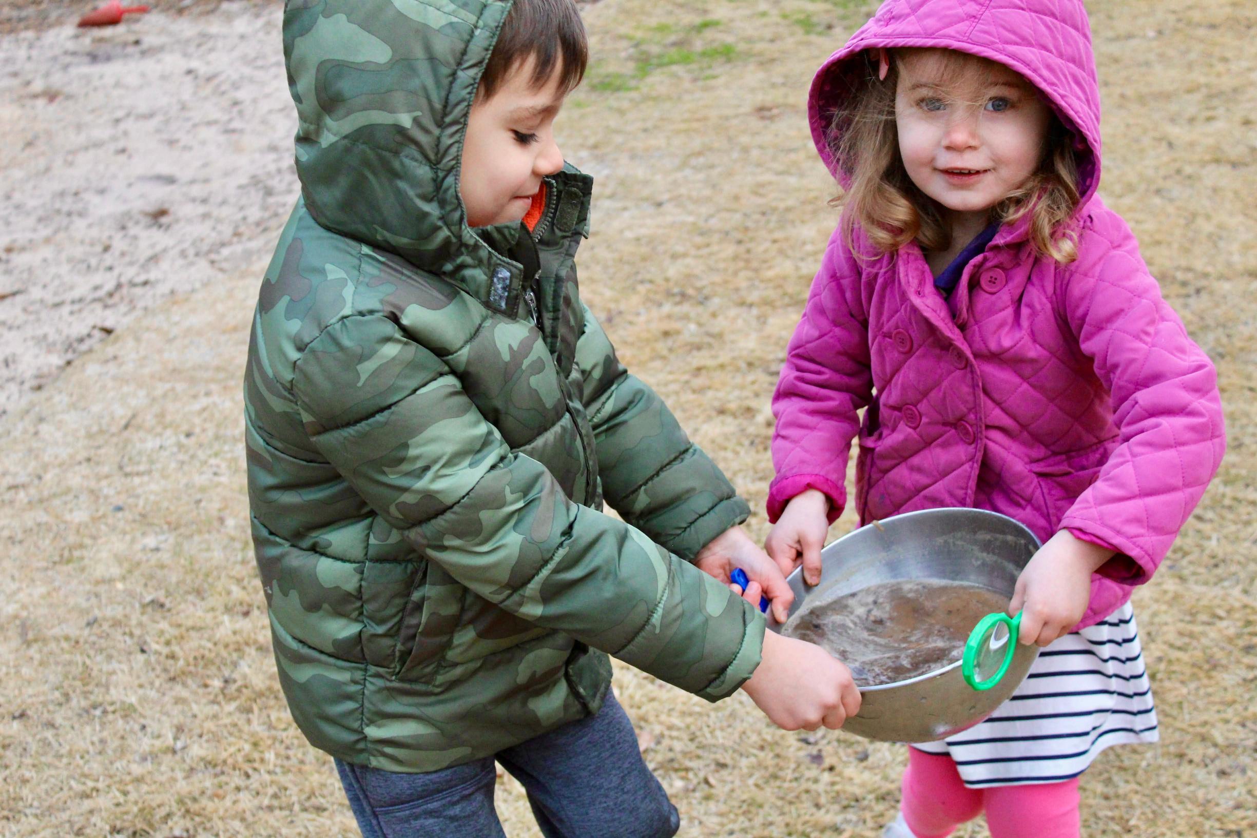 The children also focused on the sandbox. Because it had rained over the weekend, they were able to collect some standing water they found, as well as wood chips, sticks from trees, pinecones, and leaves Their excitement was palpable: outside, on a mission, and everything is treasure