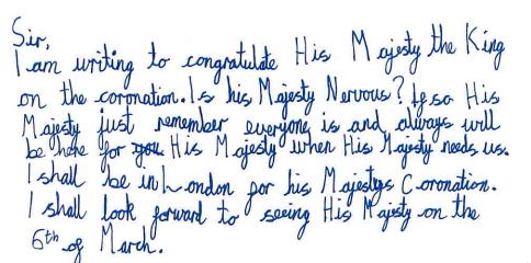 Form 4 pupils posted their letters to the King in early May to wish him luck for the Coronation. The children shared their interests and news with His Majesty, offered useful advice on how to stay brave on the day of the Coronation and let him know that they are ‘there for him’ if he needs them!