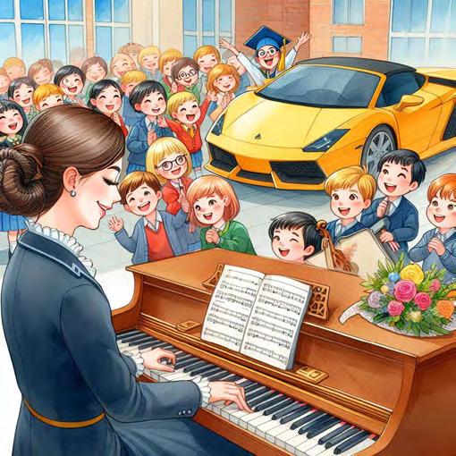 • A school teacher playing the piano in a concert with many happy children. A yellow sports car in the background. Drawn using watercolours.