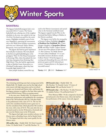 Winter Sports BASKETBALL The Jaguars basketball program had a very successful 2016-17 season. The Varsity basketball team, playing one of the toughest schedules in the area, was ranked in the top 10 of the Cleveland.com poll for the entire season. Highlights included a pair of wins over Magnificat, capturing the tournament title at the Walsh Jesuit holiday tournament, and wins over Lakewood, Padua, Hoban, Brunswick, Avon and North Royalton. The Jaguars also had two great experiences that took place in January. The team played in the first-ever girls basketball game at the prestigious “Flyin’ To The Hoop Tournament” in Kettering, Ohio, where they played the twotime State champions from Kettering Alter High School. They also had the opportunity to play at Quicken Loans Arena prior to a Cleveland Cavaliers game, where they beat Louisville High School 47-39. Saint Joseph Academy earned the top