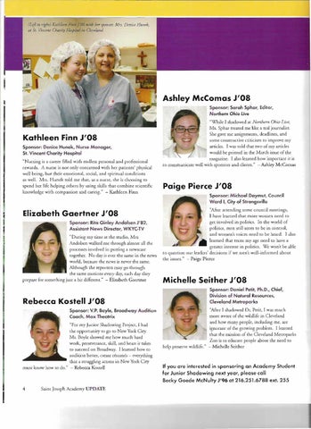 Paige Pierce j'08 Sponsor: MichQel Daymut, Council Word I, City of Strongsvi'lle "After attending some council meetings, I have learned that more women need m gee involved in polirics. In the world of polirics, men srill seem to be in control, and women's voices need to be heard. I also leamed that teens my age need to have a greater interest in politics. We won't be able to question Oll( leaders' decisions jf we aren't well-informed about the issues." - Paige Pierce
