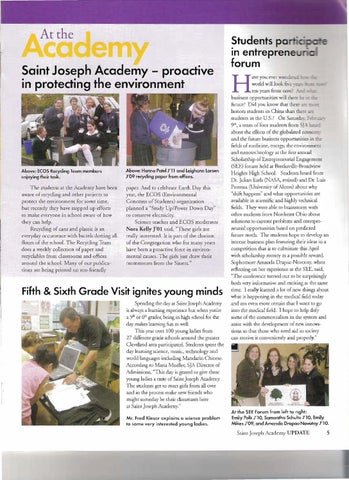 Fifth & Sixth Grade Visit ignites young minds Spending the day ar Saint Joseph Academy is always a learning experience but when yon're a 5th or 6tb grader, being in high school for (he day makes learning fun as well. This year ovet 100 young ladies from 27 differenr grade schools around rhe greater Cleveland area parricipared. Srndenrs spent (he day learning science, music, technology and world languages including Mandarin Chinese. According ro Maria Mueller, SJA Directot of Admissions, "This day is geared to give (hese young ladies a raste of Saint Joseph Academy. The students get ro meet girls from all over and in the process make new friends who might someday be (heir classmates here at Saint Joseph Academy." Mr. Fred Kieser explains 0 science problem to some very interested young ladies.