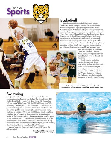 Sports Basketball Saint Joseph Academy basketball wrapped up the 2008-2009 season with great success. The season showed tremendous progress, highlighted by the Varsity Team’s Christmas trip to Alabama for a 3-game holiday tournament, and their huge regular season win over Magnificat on January 31st. Four seniors, Maura Heffernan, Leighann Larsen, Teresa Mangan and Bridget Urban, exemplified great leadership and the entire team worked extremely hard at improving themselves and achieving individual and team goals. “The seniors were truly positive role models for the younger players,“ according to Head Coach Dave Murphy. Congratulations go to Seniors Leighann Larsen and Teresa Mangan, who were selected to play in the Greater Cleveland Basketball Coaches Association All-Star game and were named by Sun News to the girls AllSun team. Coach Murphy and all the coaches deserve credit for the outstanding performance from their teams. The future looks bright for the Jaguars as the Varsity team finished with a 12-11 record while the JV team finished at 13-4 and the Freshmen compiled an equally impressive record of 15-3 respectively.
