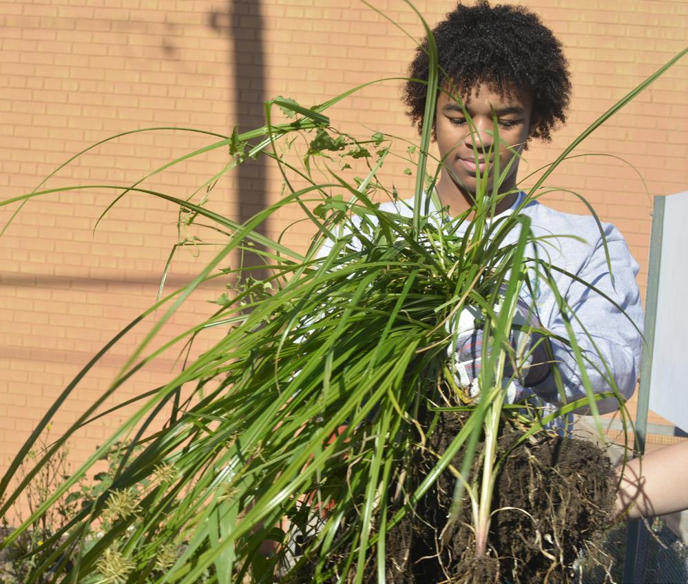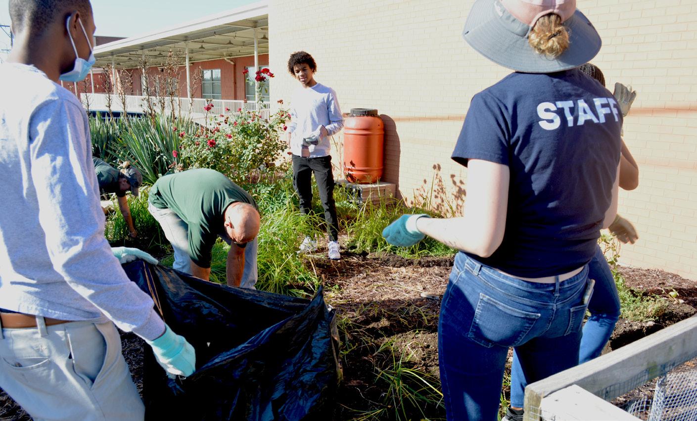 The YES Teens tore up the old garden beds with hammers and crowbars, did cleanup work, and then worked together to assemble the new beds—moving wood, lining up corners for the beds, and drilling holes and assembling. Grabbing shovels and wheelbarrows, the YES Teens moved dirt and filled in the beds so that they were ready for the day’s next activities: planting lettuce, as well as refilling the rain barrels and trimming back the irises.