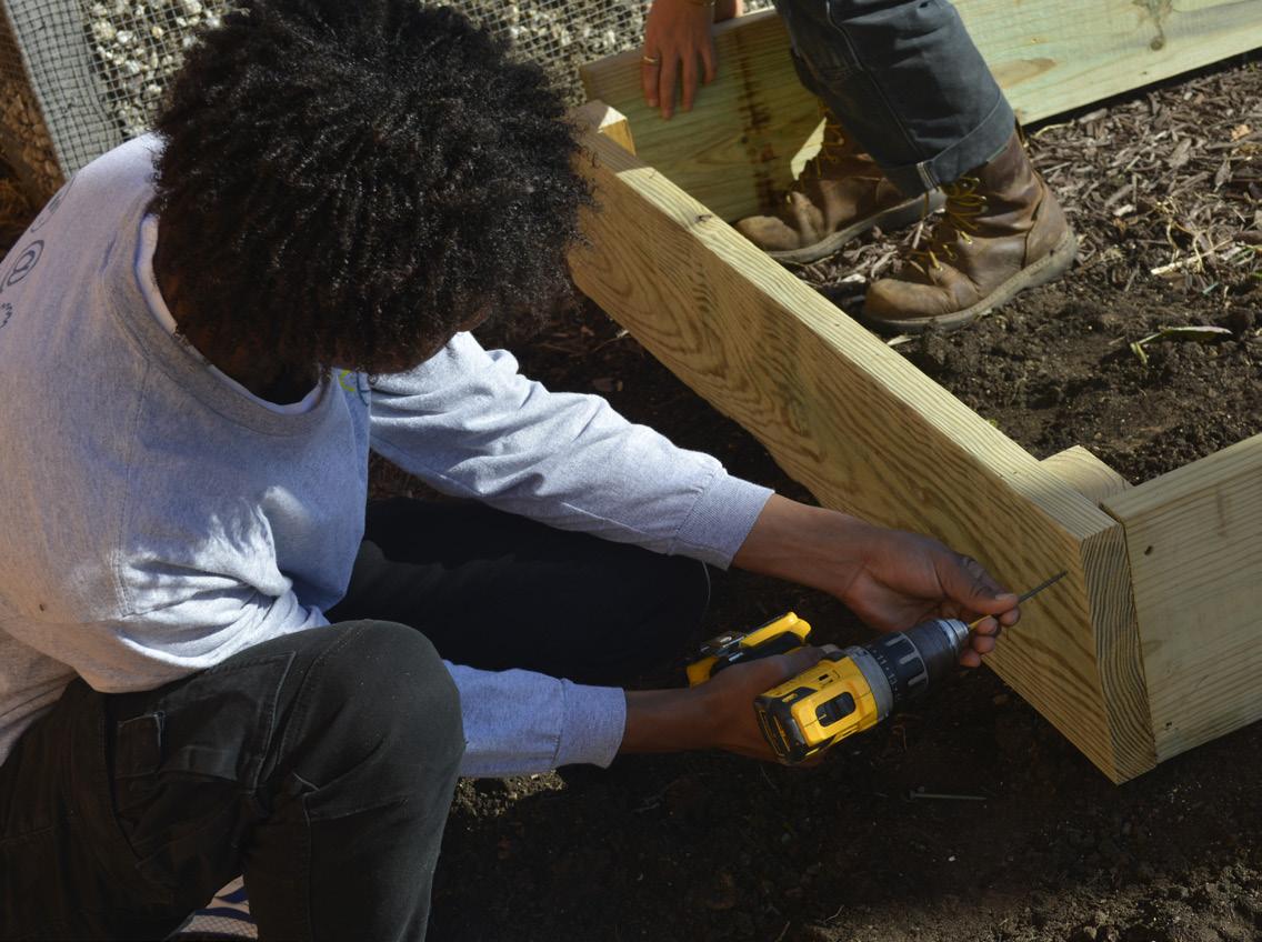in the YES Program to collaborate. Teens from the Media Arts component chipped in to help with breaking down the old beds, shoveling dirt, and building the new garden beds, in addition to capturing photos of the day. (In fact, the three photos in this story come from our YES Teens!) Plus, teens from the Engineering component took turns helping shovel dirt in between driving a go-kart.